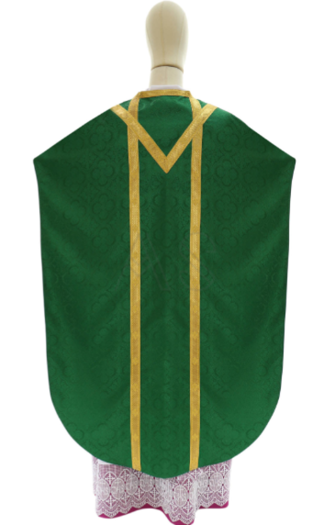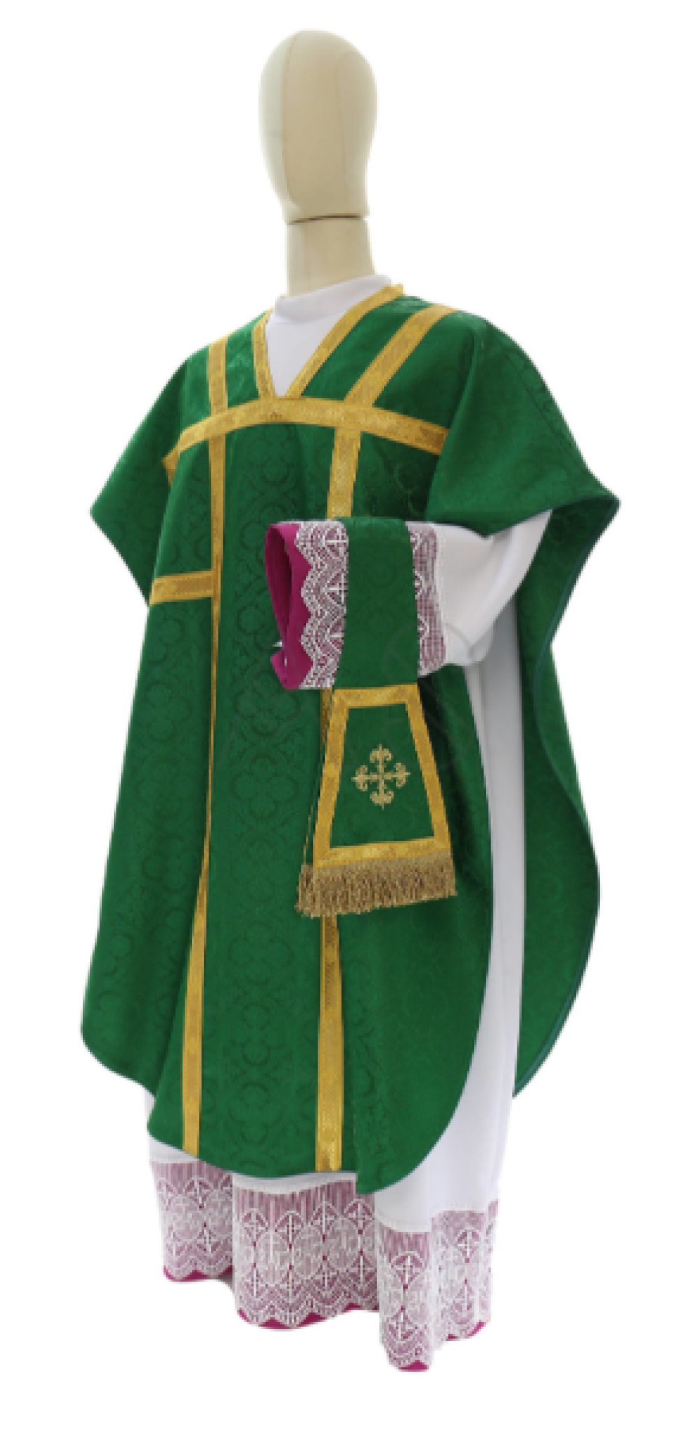 Chasuble coupe dit Saint Philippe Néri en polyester damassé verte.