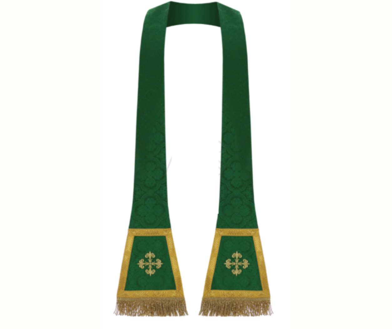 Orné d'un galon doré qui forme une croix devant et une bande sur le dos de l'ornement.