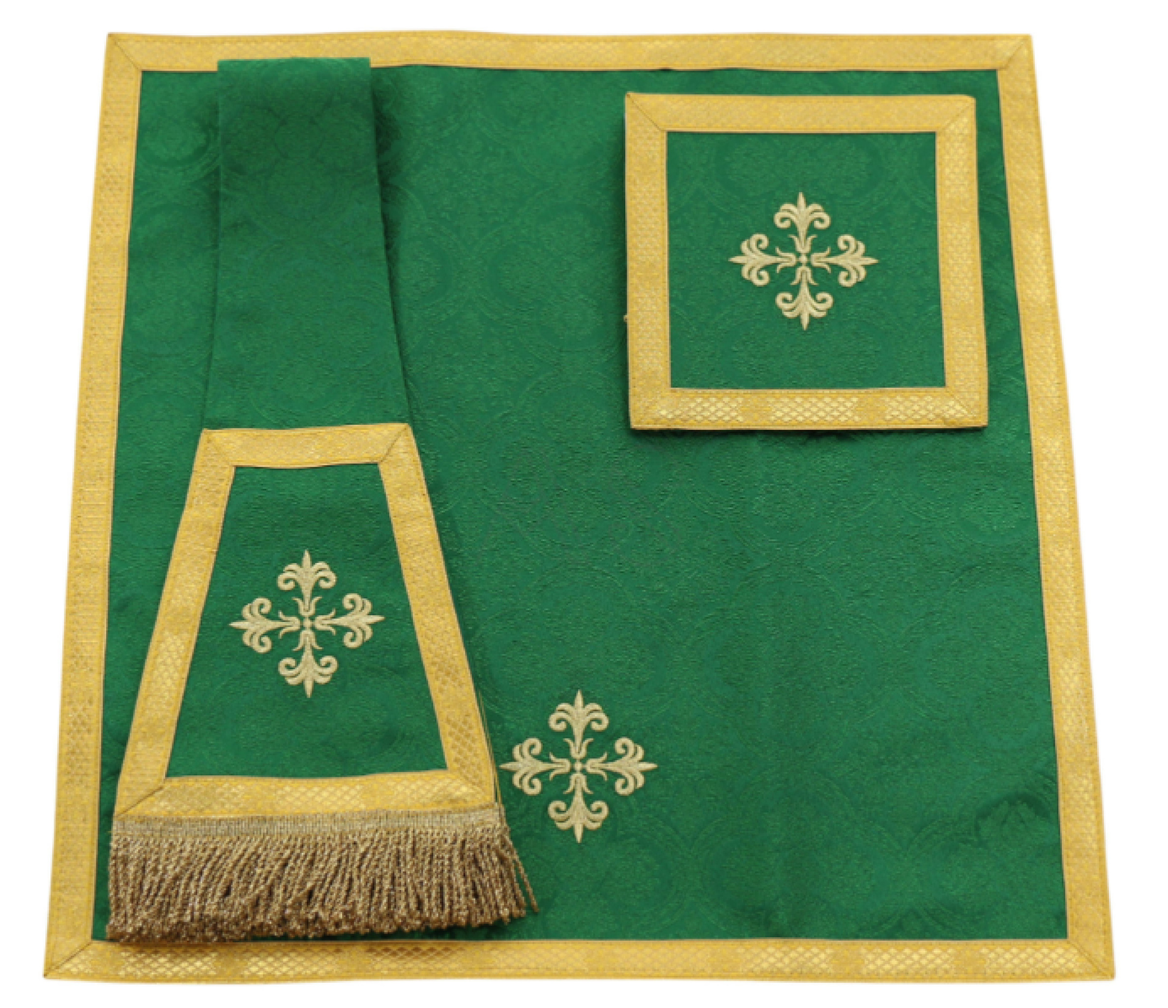 Longueur 122 cm, largeur aux épaules 95 cm. Fournie avec son voile de calice, son étole, sa bourse (format 18 x 18 cm sans soufflet), son voile de calice (format 51 x 51 cm) et son manipule.