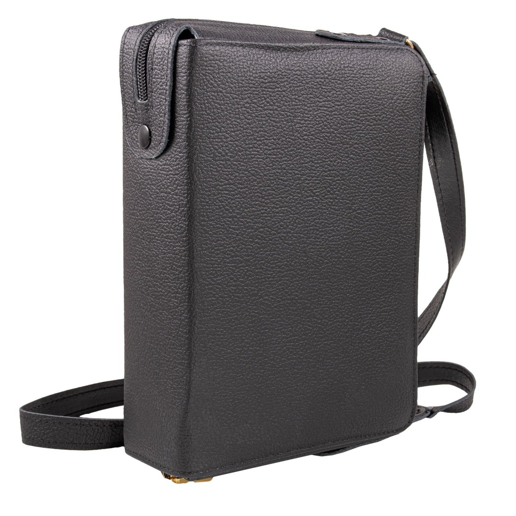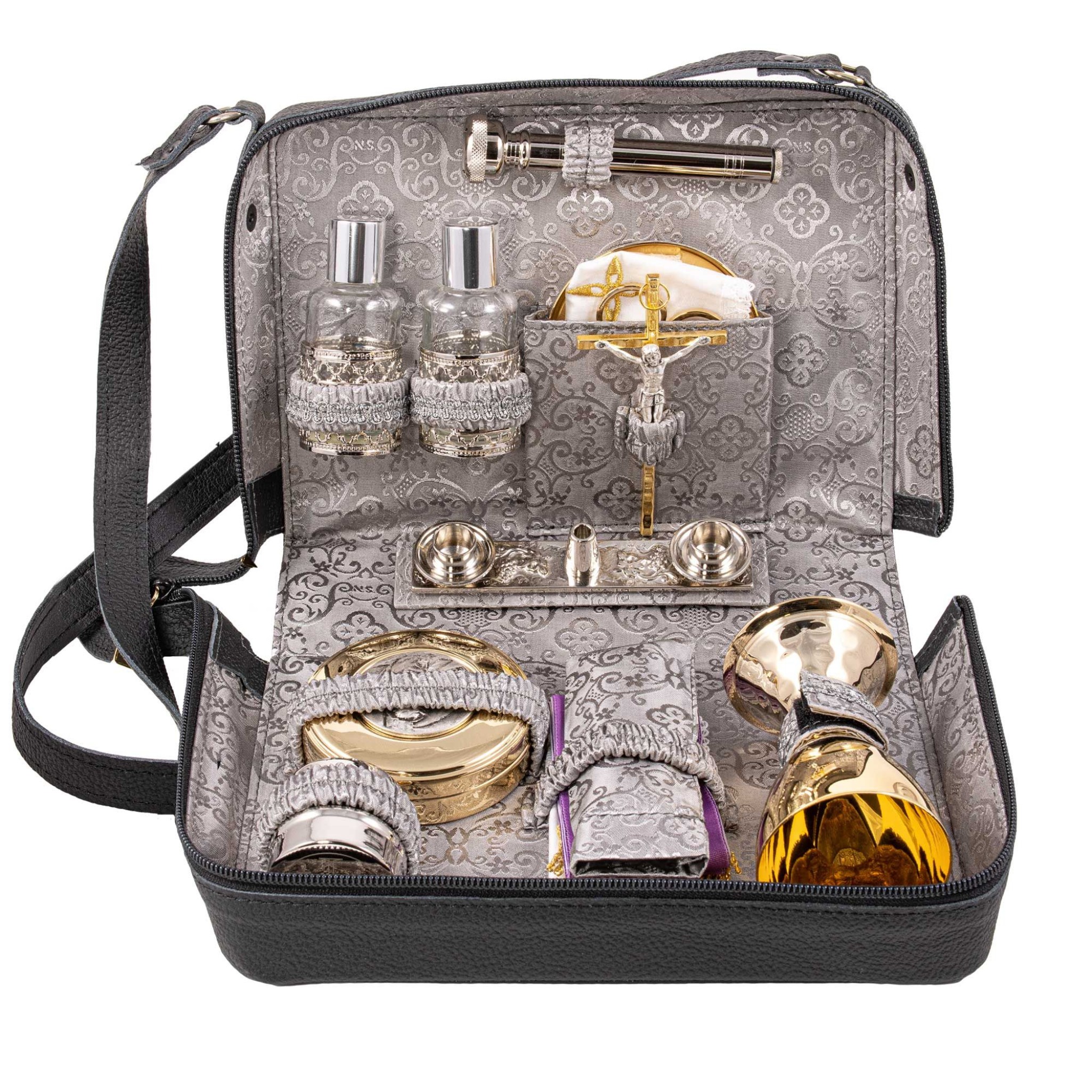 Sac en cuir véritable avec bandoulière, doublé intérieurement de satin gris et complet avec tout le nécessaire pour la célébration en plein air.
