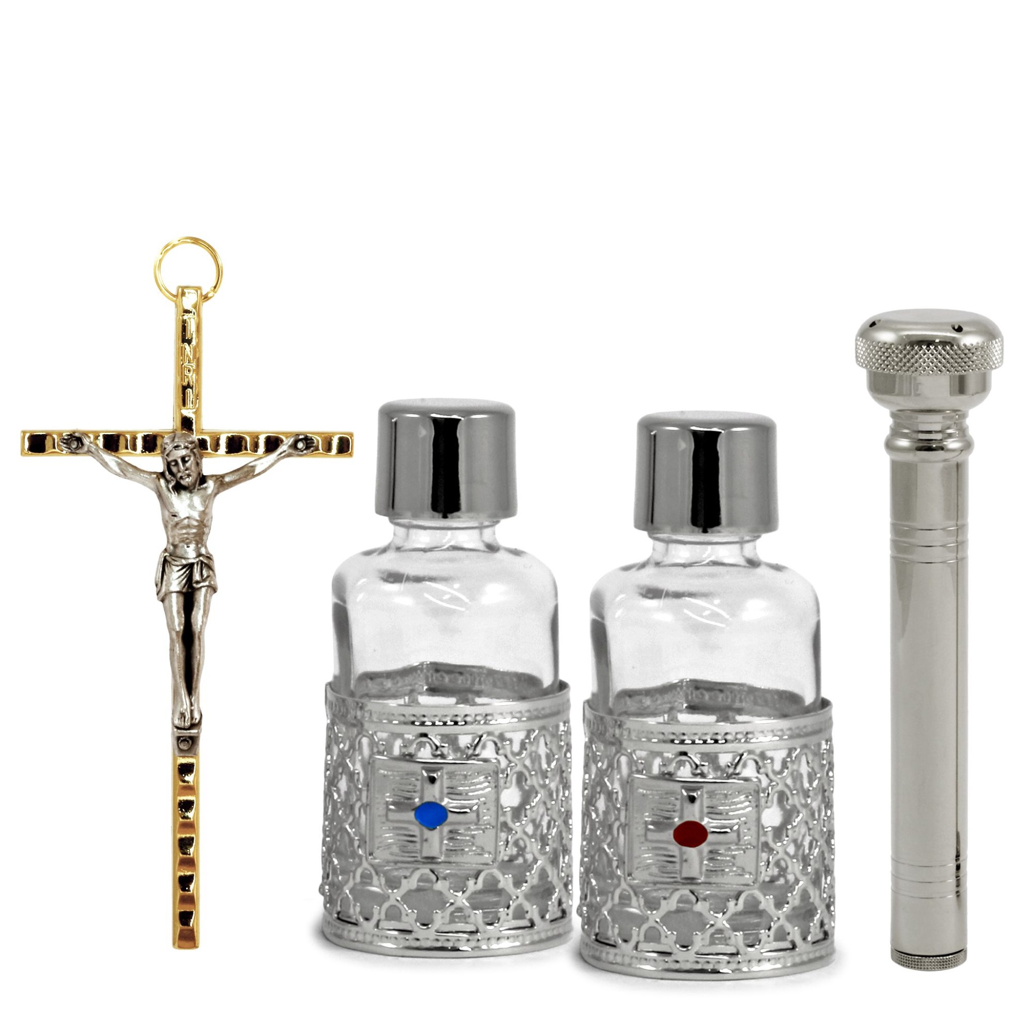 - Ampoule en verre pour huiles saintes avec armure de protection en laiton argenté avec croix de Jérusalem gravée sur le couvercle.