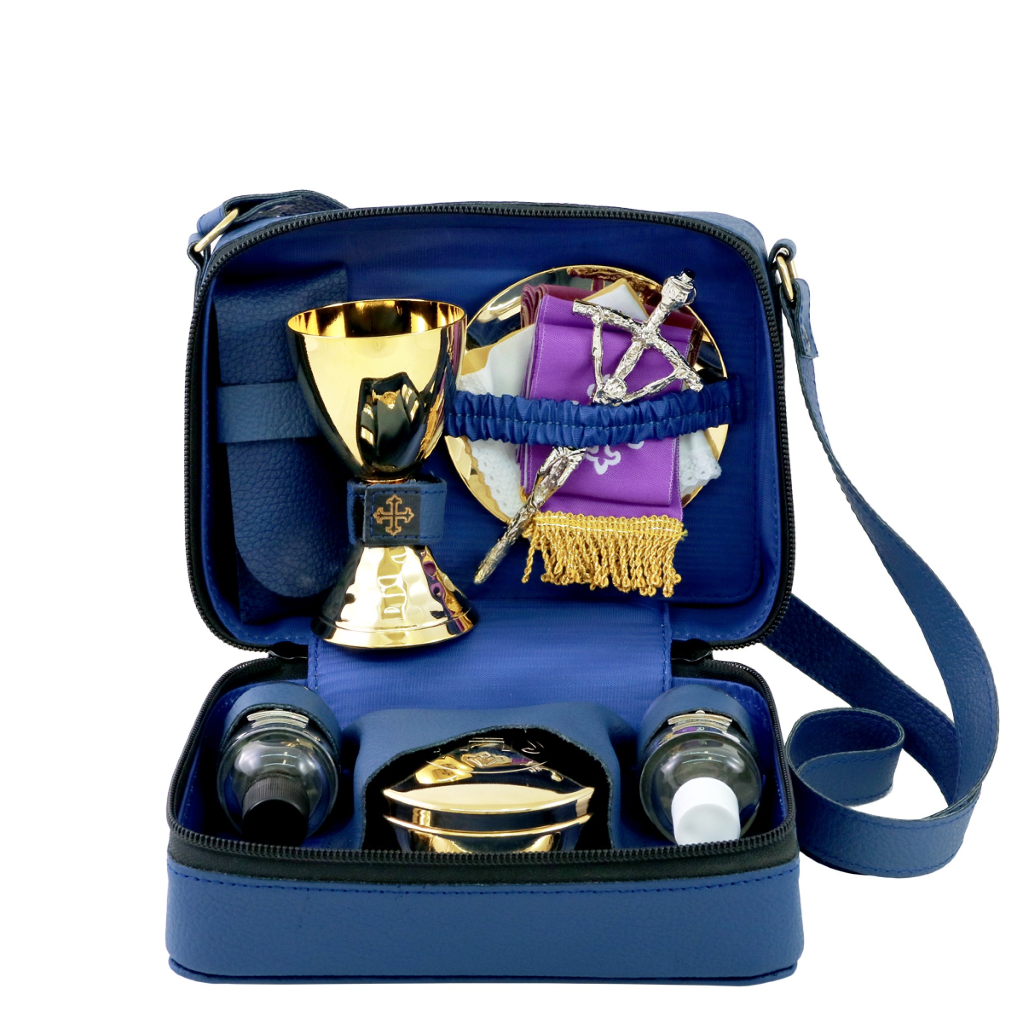 Sac en cuir véritable bleu avec bandoulière, doublé intérieurement en satin bleu et complet avec tout le nécessaire pour la célébration en plein air.