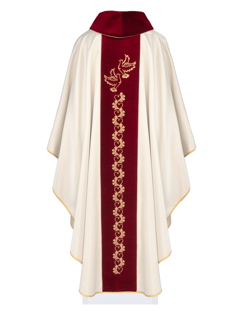 380,07€ TTCChasuble de mariage en tissu uni de haute qualité, décorée d'anneaux brodés, de colombes, de coeurs et de l'inscription "Je te jure amour fidélité...".