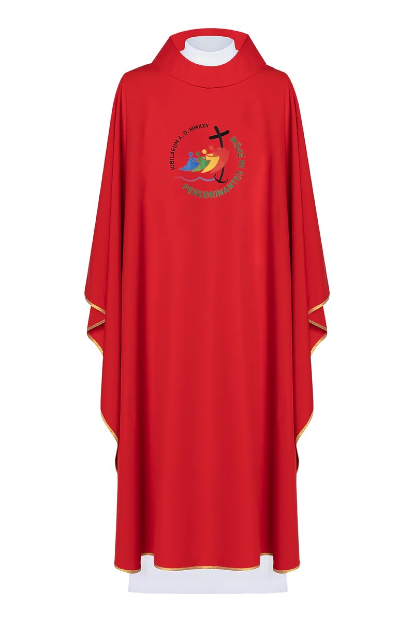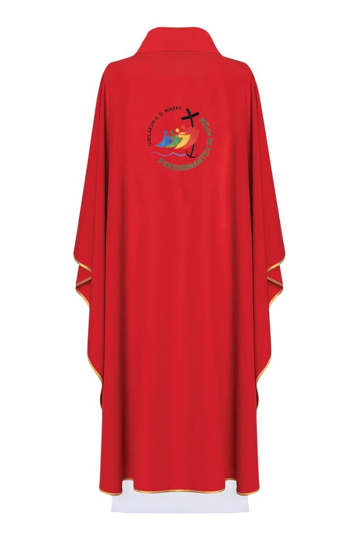 Cette chasuble rouge avec broderie du jubilé a été créée pour les célébrations de toute cette année si unique, le jubilé 2025.