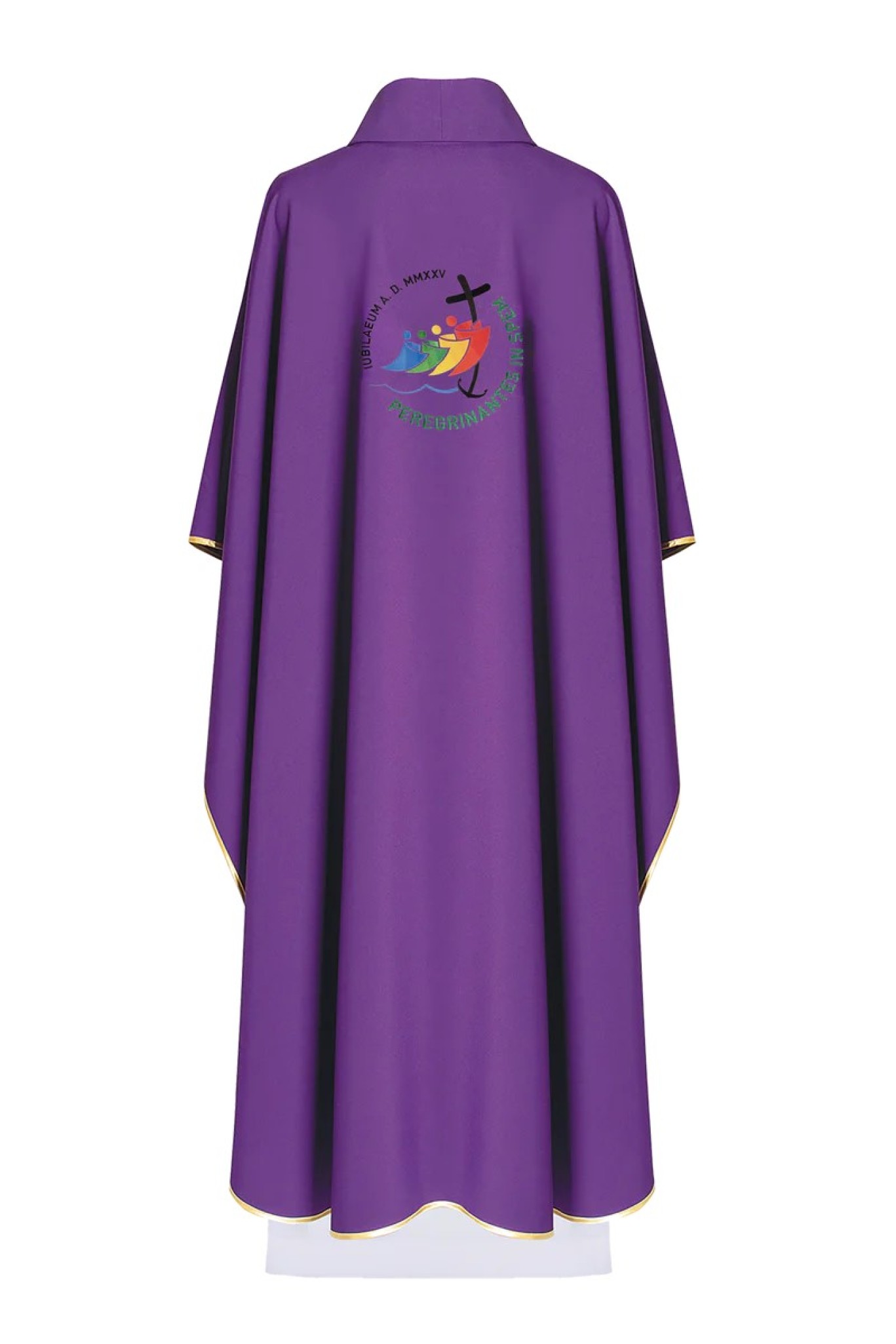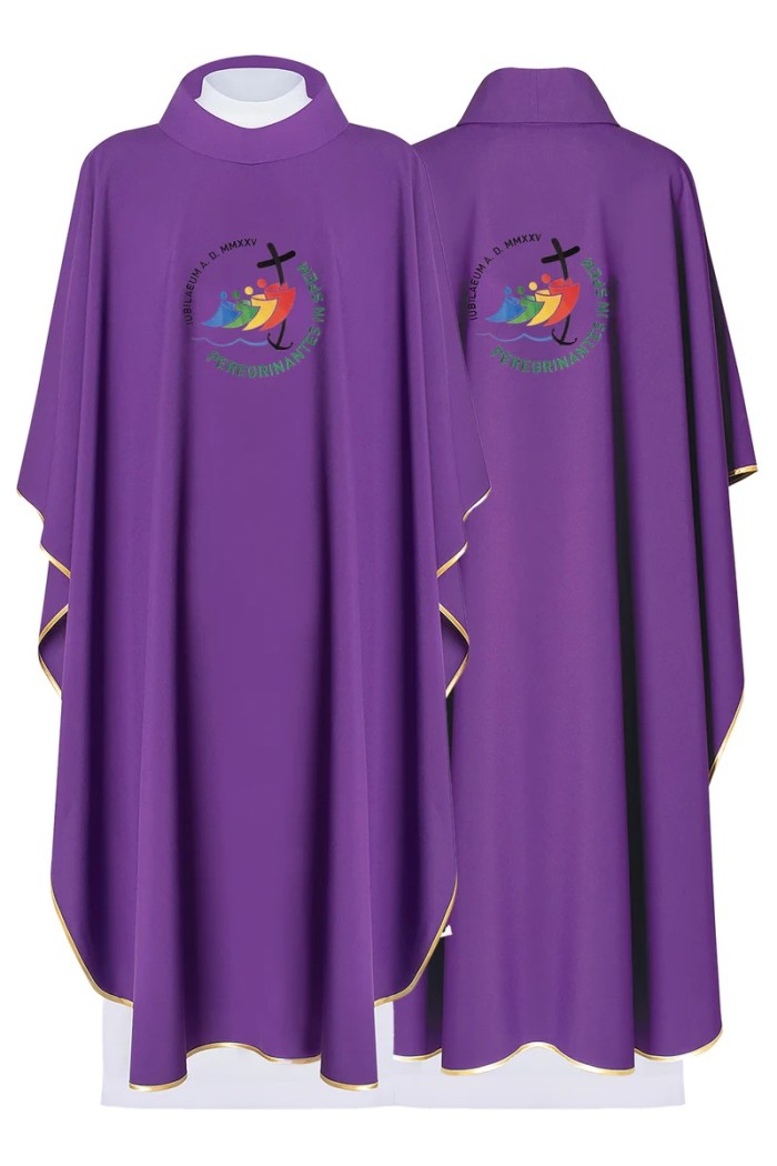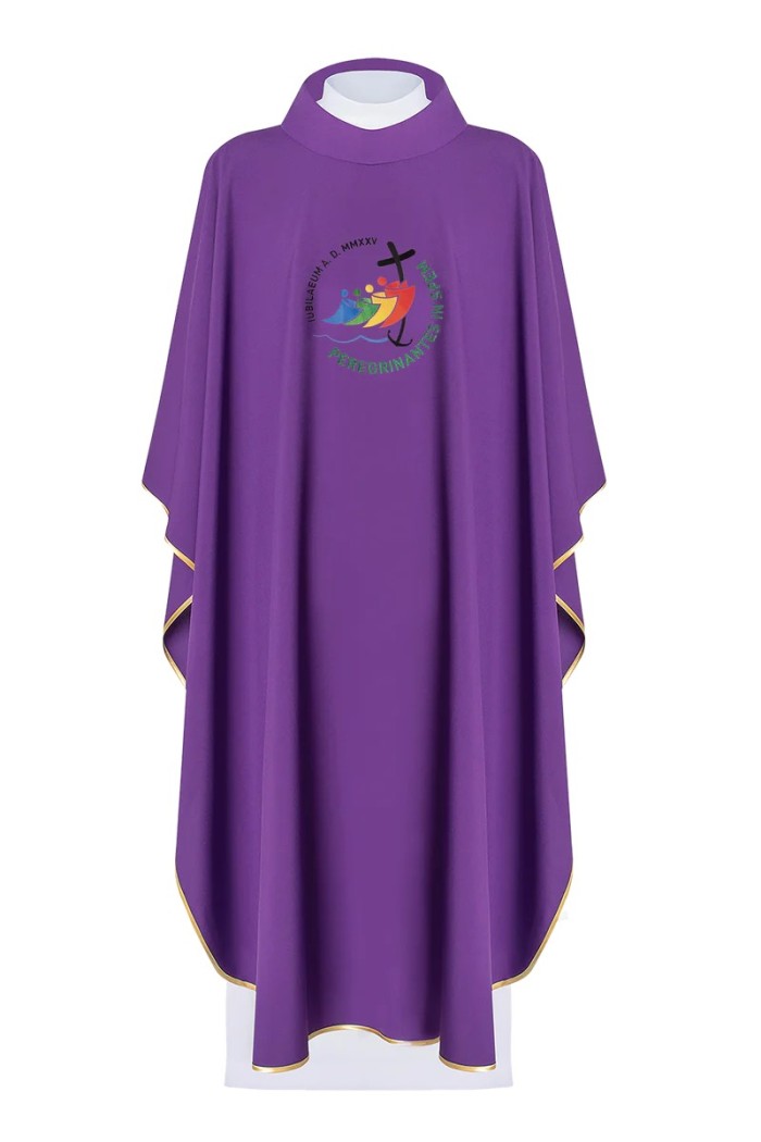 Cette chasuble violette avec broderie du jubilé a été créée pour les célébrations de toute cette année si unique, le jubilé 2025.