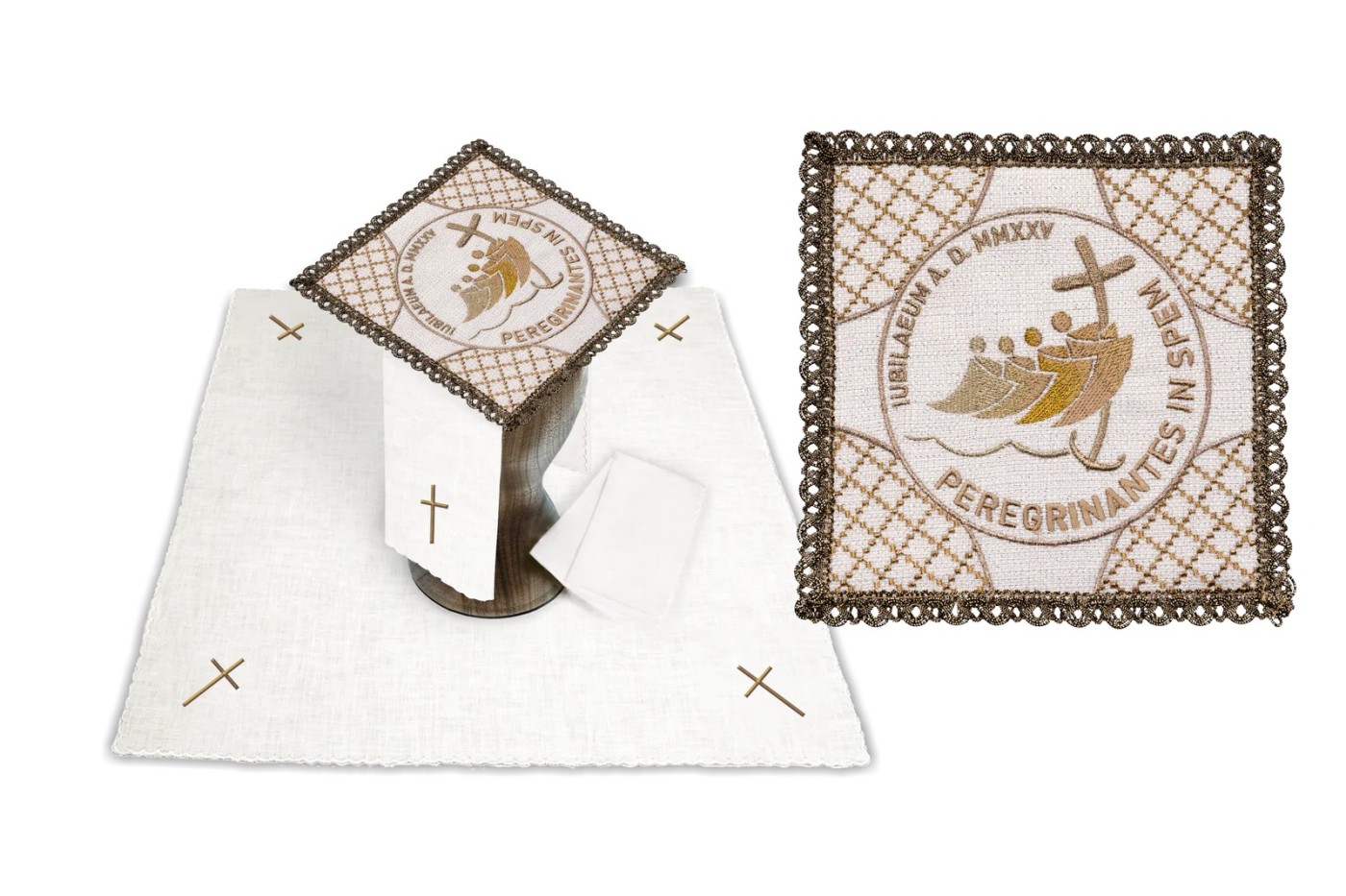 Ce set de calice, spécialement créé pour célébrer le Jubilé de l'Église catholique, reflète la solennité de cet événement exceptionnel. La broderie du logo du Jubilé orne chaque pièce.