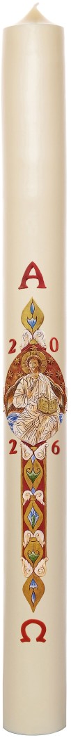 Procédé traditionnel de fabrication pour ce cierge pascal qui manifestera la lumière de la résurrection pendant la veillée Pascale. Chacun des angles du cierge pascal formés par les bras de la croix sont inscrits un des quatre chiffres du millésime de l'année. Au-dessus et au-dessous de la croix, la première lettre (Alpha) et la dernière lettre (Omega) de l'alphabet grec sont inscrites, manifestant que le Christ est "commencement et fin de toutes choses"