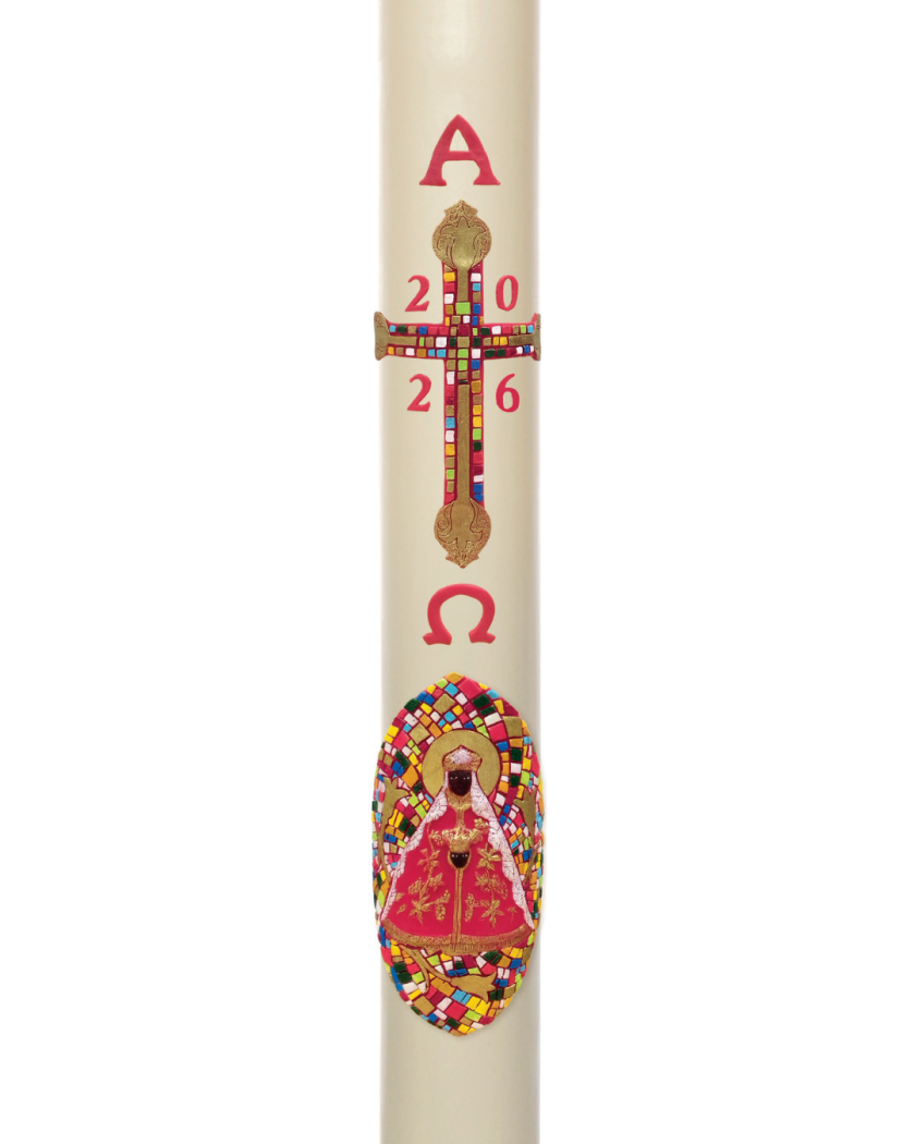 Procédé traditionnel de fabrication pour ce cierge pascal qui manifestera la lumière de la résurrection pendant la veillée Pascale. Chacun des angles du cierge pascal formés par les bras de la croix sont inscrits un des quatre chiffres du millésime de l'année. Au-dessus et au-dessous de la croix, la première lettre (Alpha) et la dernière lettre (Omega) de l'alphabet grec sont inscrites, manifestant que le Christ est "commencement et fin de toutes choses"