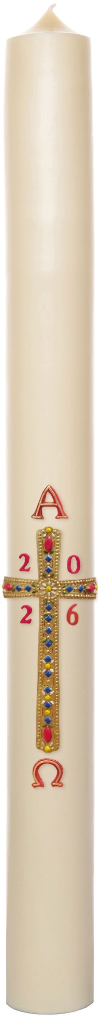 Procédé traditionnel de fabrication pour ce cierge pascal qui manifestera la lumière de la résurrection pendant la veillée Pascale. Chacun des angles du cierge pascal formés par les bras de la croix sont inscrits un des quatre chiffres du millésime de l'année. Au-dessus et au-dessous de la croix, la première lettre (Alpha) et la dernière lettre (Omega) de l'alphabet grec sont inscrites, manifestant que le Christ est "commencement et fin de toutes choses"