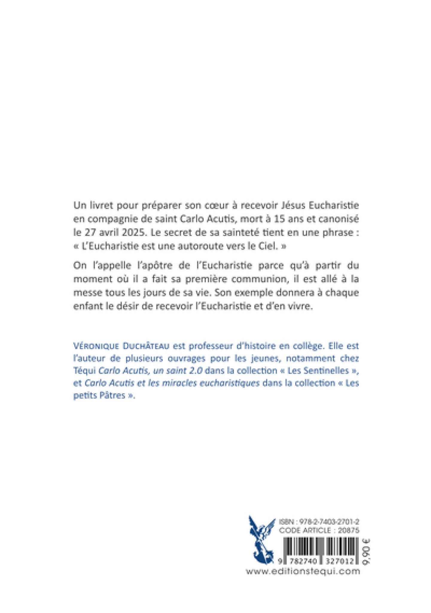 « Carlos Acutis est le saint dont le XXIe siècle a besoin ! Sa vie nous prouve que l'on peut vivre aujourd'hui, dans notre monde tel qu'il est, le message de l'Évangile », nous dit l'auteur. Dès son plus jeune âge, Carlo s'est tourné vers les autres, il est resté simple, il a été généreux et il s'est passionné pour le sacrement de l'Eucharistie. Pourquoi l'appelle-t-on l'apôtre de l'Eucharistie ? Parce qu'à partir du moment où il a fait sa première communion, il est allé à la messe tous les jours de sa courte vie. Il vivait véritablement de l'Eucharistie. Il ne comprenait pas pourquoi si peu de monde allait puiser à la source de toutes les grâces, c'est pourquoi il a utilisé ses talents en informatique pour monter une grande exposition sur les miracles eucharistiques, qui existe aujourd'hui en 18 langues : http://www.miracolieucaristici.org/ Le secret de sa sainteté tient en une phrase : « L'Eucharistie est une autoroute vers le Ciel. »