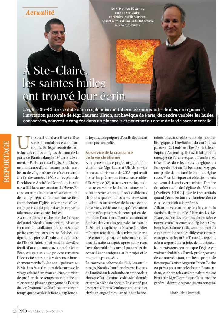 Mes armoires pour les saintes huiles sont visibles à Paris à Saint Etienne du Mont, Saint Louis en L'Ile et Sainte Claire. Les façades sont rétro-éclairées, ce qui permet de diffuser une lumière propre au recueillement.