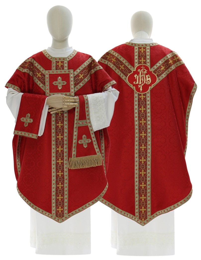 Le dos de la chasuble est décoré de l'emblème IHS. L'ensemble est entièrement doublé.