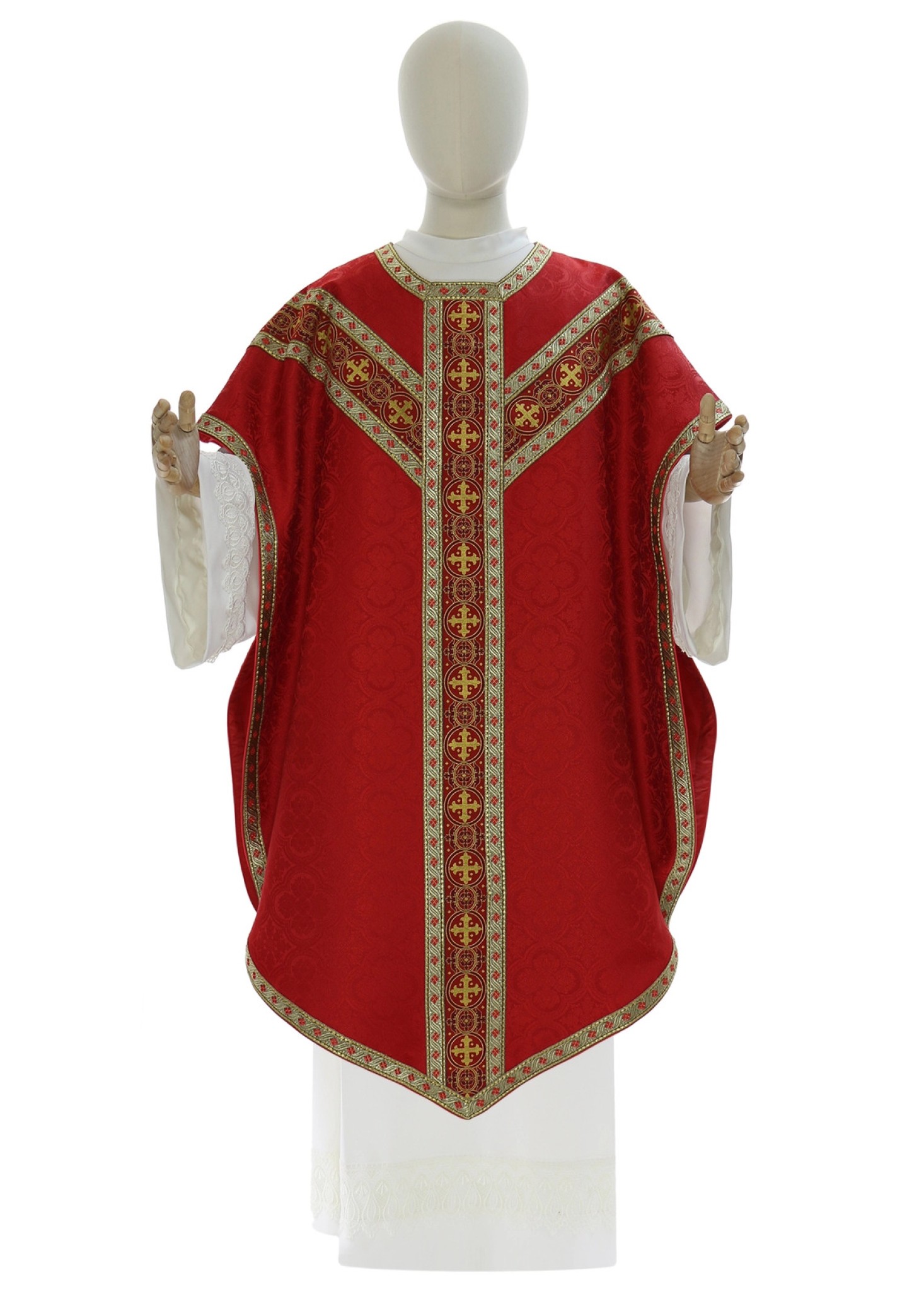 Appliquée aux chasubles, la coupe Pugin désigne une forme ample et fluide, inspirée des vêtements liturgiques médiévaux, privilégiant le tombé naturel du tissu, la simplicité des lignes et la liberté de mouvement du célébrant. Cette coupe met en valeur la verticalité et la sobriété, en accord avec l'esprit liturgique traditionnel.