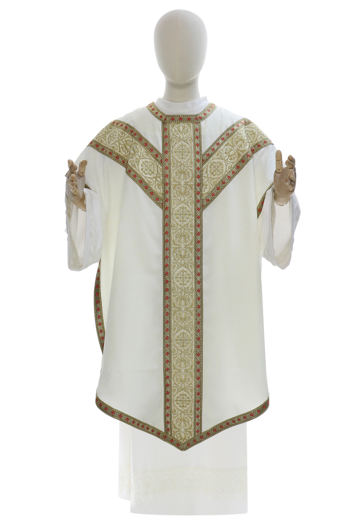 Chasuble crème damassée galon large - Coupe Pugin