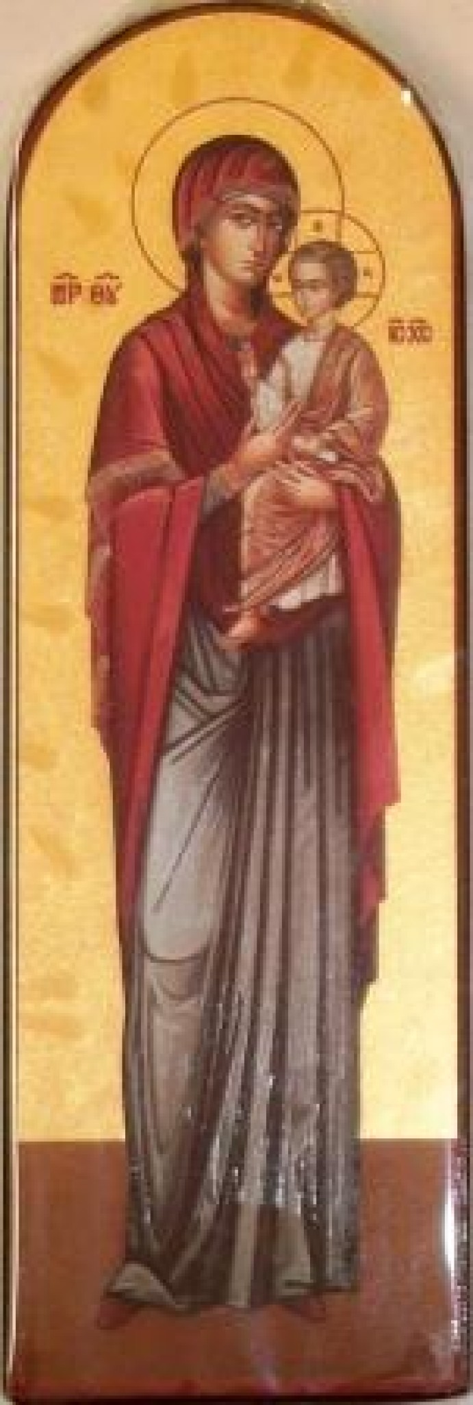 Cette icône nous vinet de la grande tradition iconographique ukrainienne. Fait assez rare, Marie est représentée debout. Cela lui donne une plus grande présence, et en même temps, cela confère beaucoup d'allure à cette icône. A droite de Marie, les lettres signifient la Mère de Dieu. Celles à droite du Christ sont les abréviations grecques de Jésus-Christ. Le visage deMarie délicatement penché vers Jésus est empreint de toute la profondeur maternelle de Marie. Ses yeux trés doux, couleur noisette, nous entraînent dans sa méditation toute intérieure. Le Christ apporte sa bénédiction et tient en sa main droite le rouleau blanc de la Loi ancienne qu'Il vient d'accomplir. Des Couleurs et des tuniques finement brodées, qui ressortent sur l'or, jaillit cette profondeur divine qui éclaire toute chose. Cette icône peut faire un ensemble très harmonieux avec le Christ Ukrainien, de même facture.