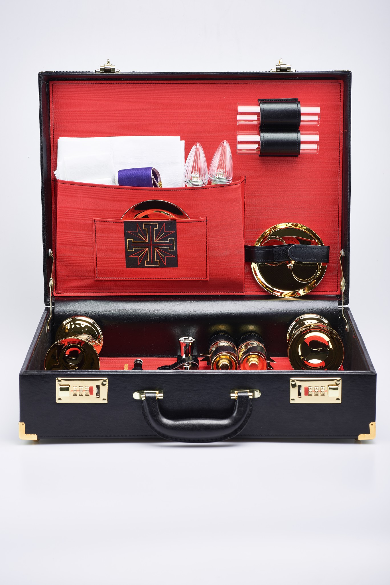 Une valise chapelle qui comprend tout le nécessaire pour célébrer la messe dans un attaché-case en aluminium recouvert de cuir noir.