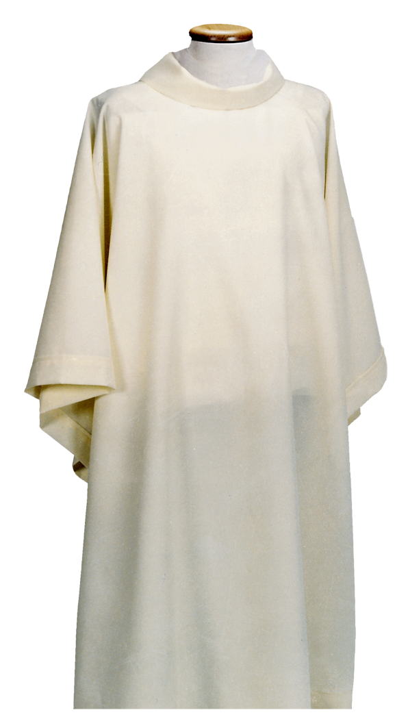 Une belle aube ample ivoire, 100% polyester, avec un col légèrement relevé devant et une fine capuche au dos.