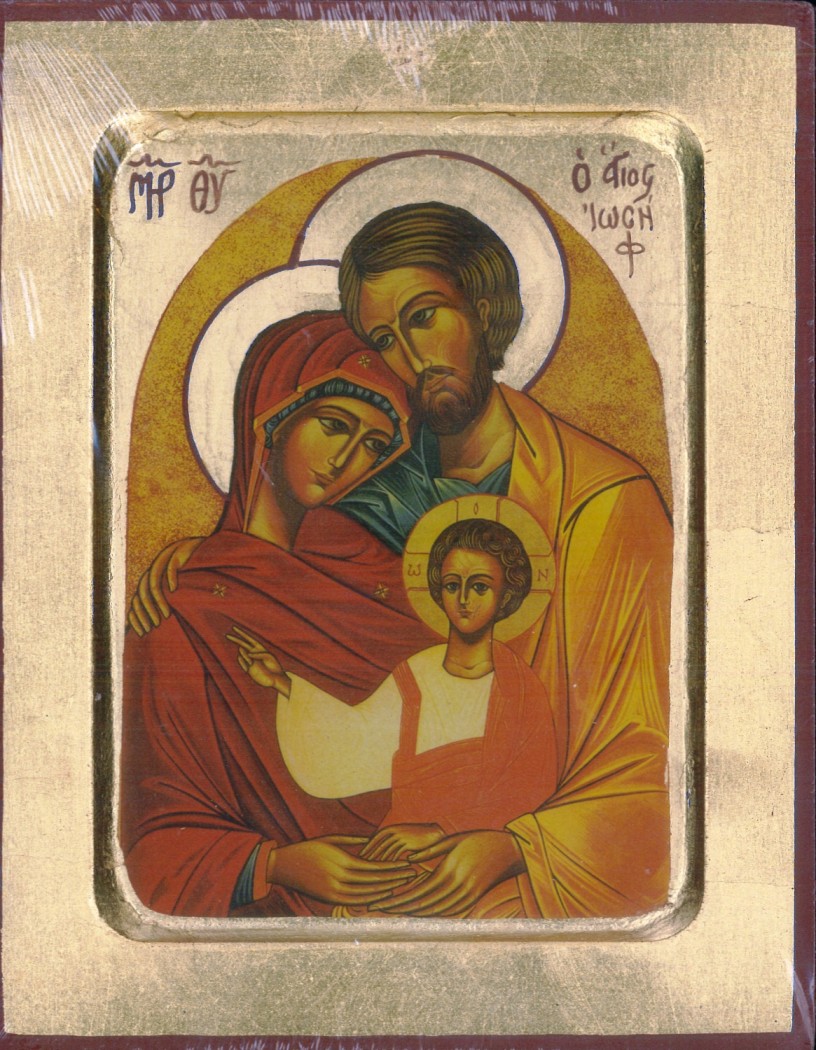 Une icône la sainte famille au format 14 x 18 cm. Cette icône est la copie d'une authentique et ancienne icône byzantine choisie parmi les meilleures, elle est reproduite sur un petit canevas et fabriquée artisanalement à la main, doré à la feuille d'or dans le style, la tradition et les critères exigés par l'école macédonienne du Mont Athos.