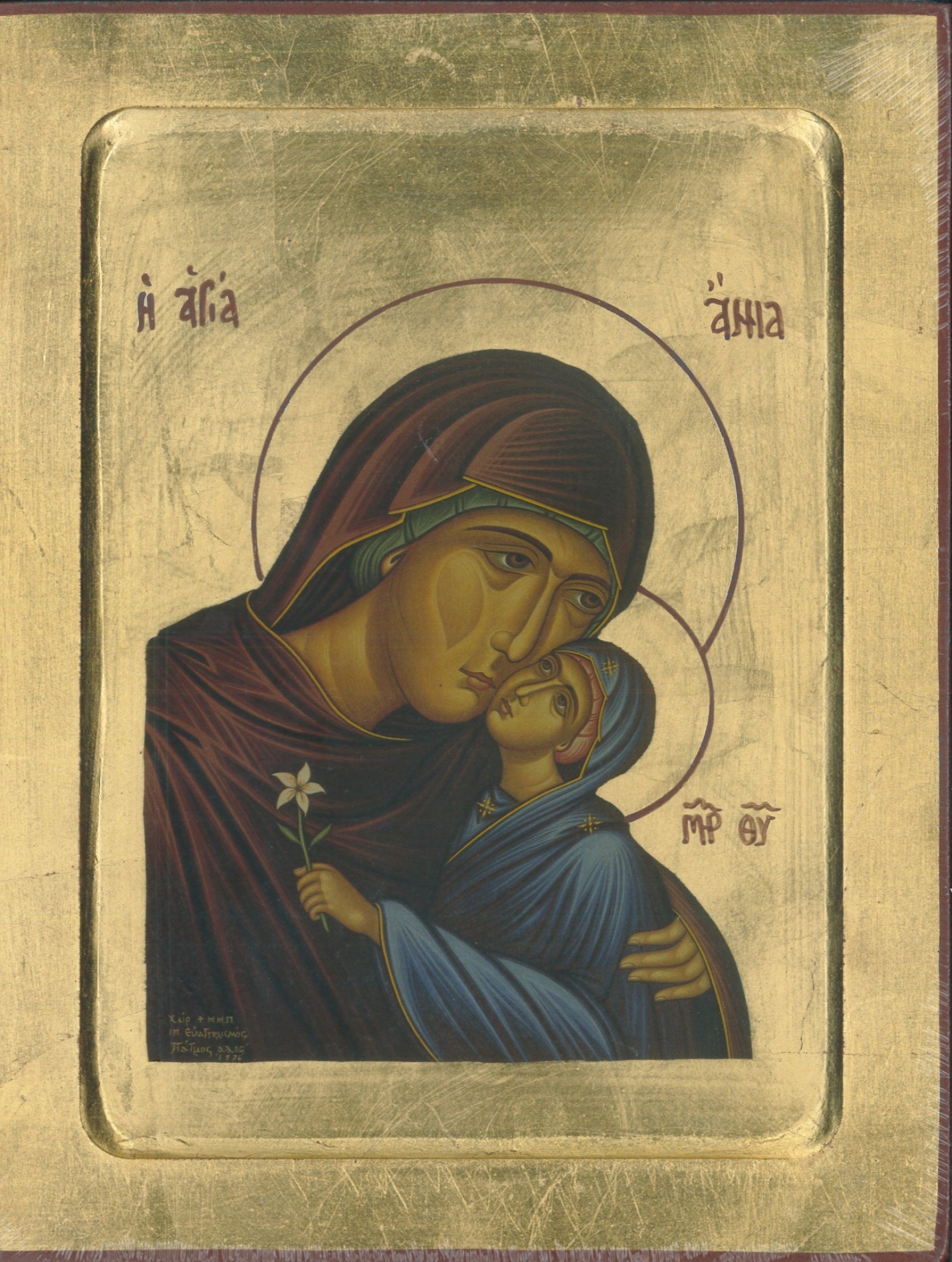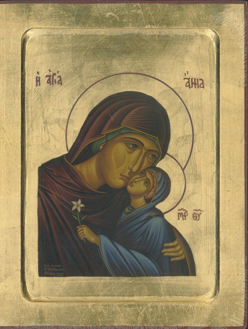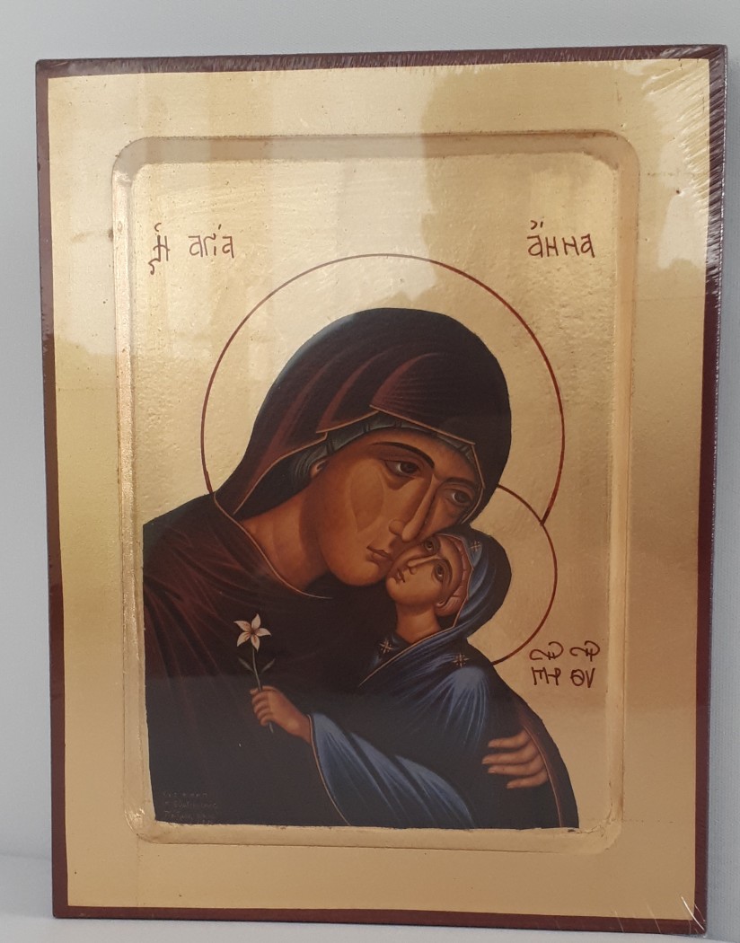 Une icône représentant sainte Anne au format 17,8 x 23 cm. Cette icône est la copie d'une authentique et ancienne icône byzantine choisie parmi les meilleures, elle est reproduite sur un petit canevas et fabriquée artisanalement à la main, doré à la feuille d'or dans le style, la tradition et les critères exigés par l'école macédonienne du Mont Athos.