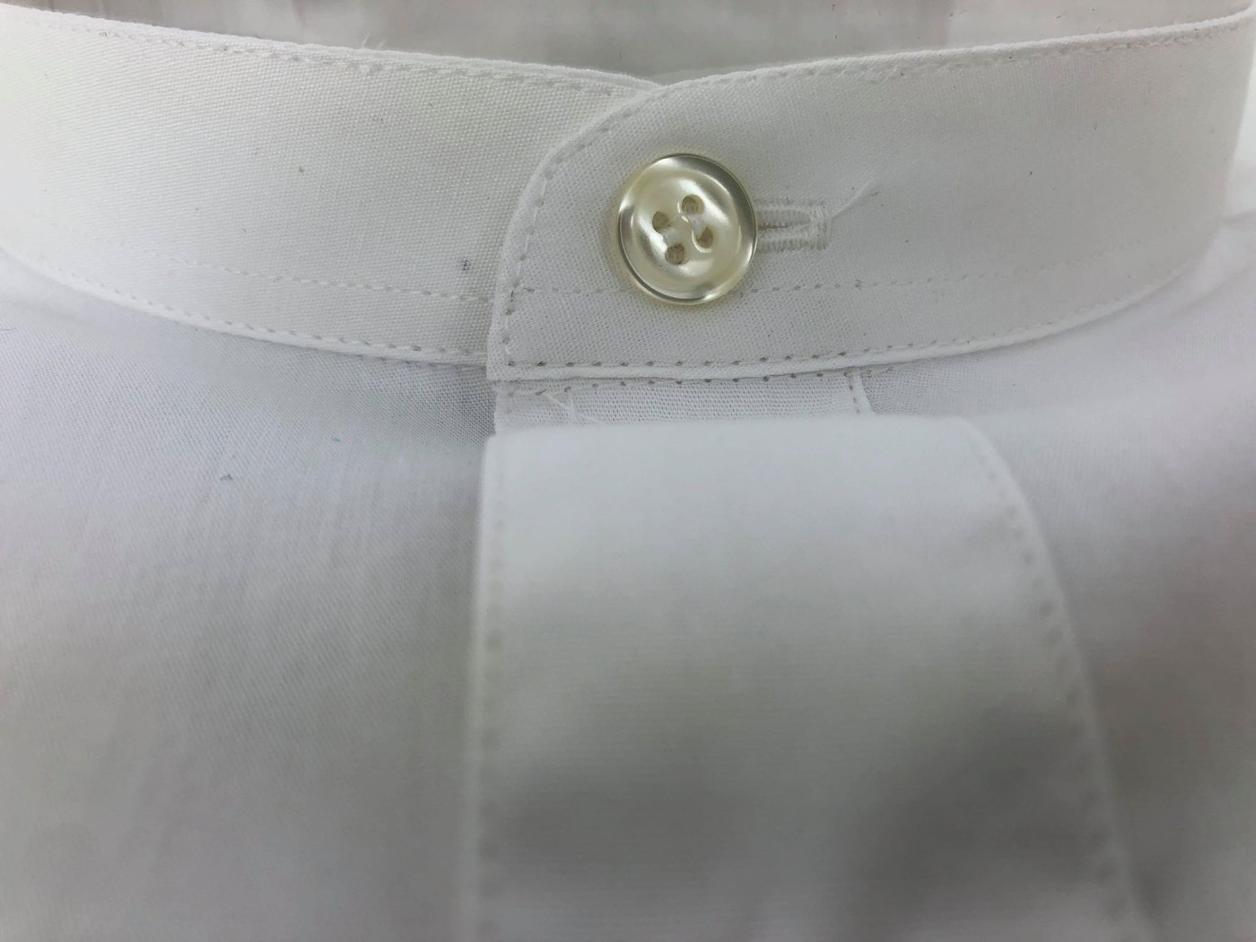 Chemise pour soutane, taille 44 cm. 100% coton. Lavable en machine à 60°, ne passe pas au sèche linge, repassage au fer à température maximale de 200° (position coton). Tissu 150 gr/M².