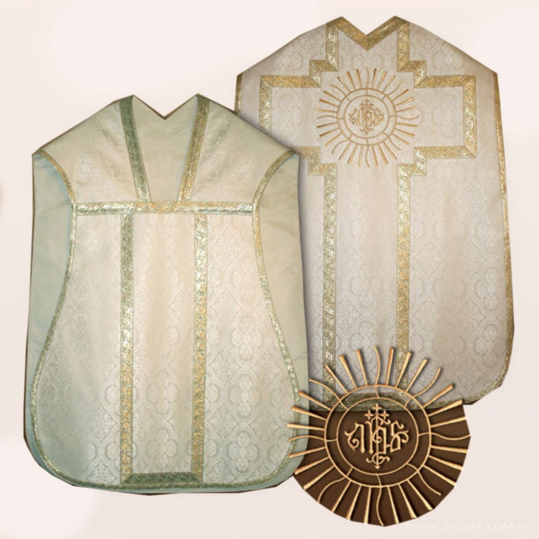 Chasuble classique dans la pure tradition latine. Bande décorative avec emblème IHS.
