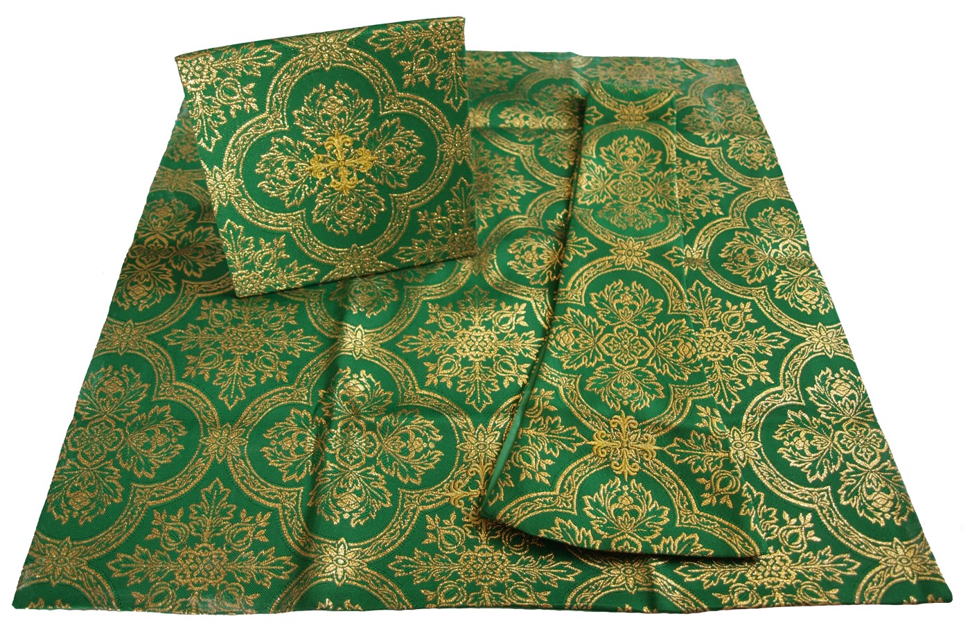 En tissu 100% polyester damassé avec reflets dorés. Dimension du voile de calice : 50 x 50 cm, dimension de la bourse : 17,5 x 17,5 cm (sans soufflet). Longueur du manipule : 40 cm (avec lacet à nouer autour du poignet).