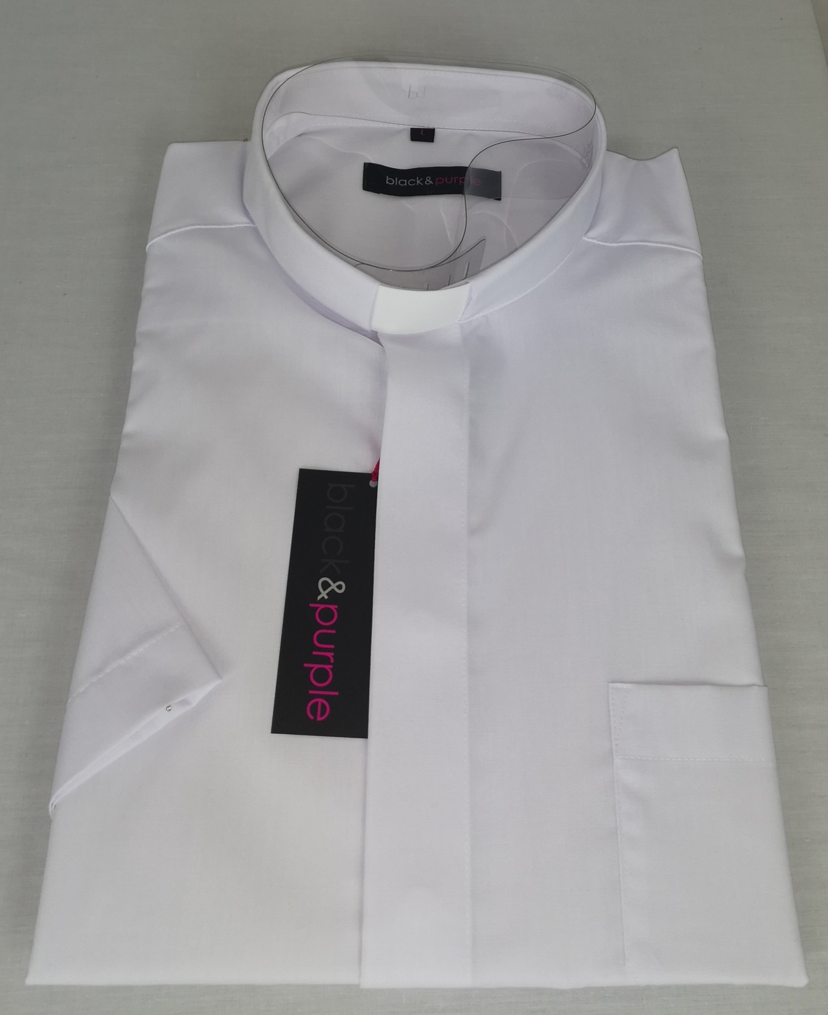 Chemise clergyman mixte polyester (45%) coton (55%) de couleur blanche. Taille de la chemise clergyman: S (équivalent 37 & 38 en tour de cou) Tour de poitrine 108 cm longueur de chemise 76 cm. Col plastique clergyman fourni et inséré dans le col. Lavable en machine à 40°, repassage facile au fer sur faible température.