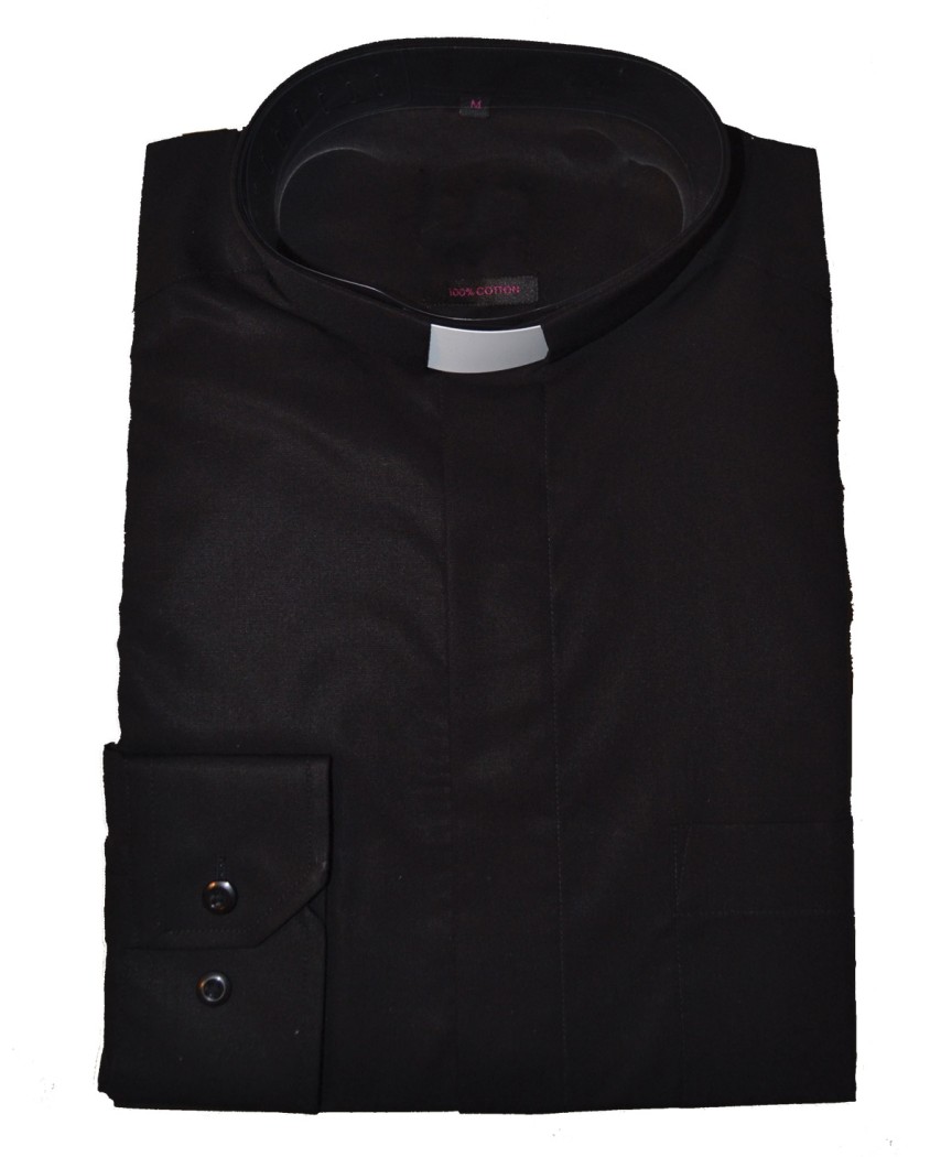 Chemise clergyman mixte polyester (45%) coton (55%) de couleur noire. Taille de la chemise clergyman: XL (équivalent 43 & 44 en tour de cou) Tour de poitrine 128 cm, longueur de manche 66 cm, longueur de chemise 80 cm. Col plastique clergyman fourni et inséré dans le col. Lavable en machine à 40°, repassage facile au fer sur faible température.