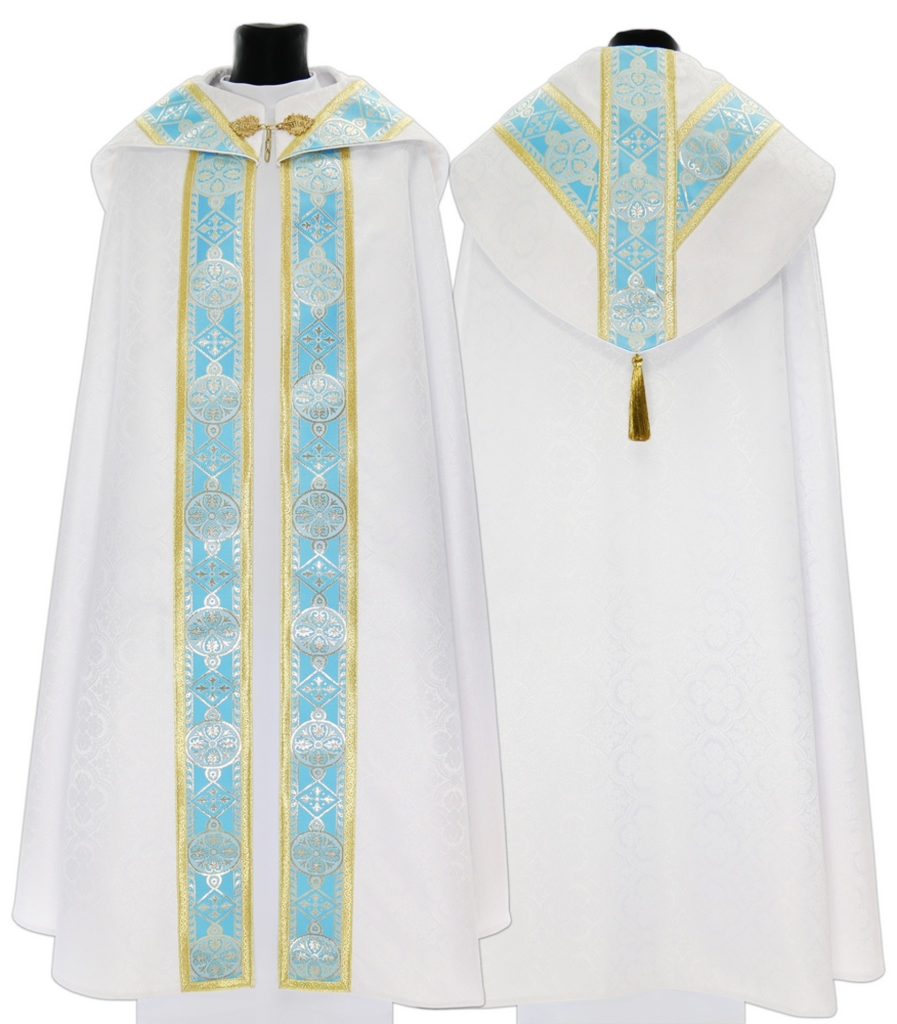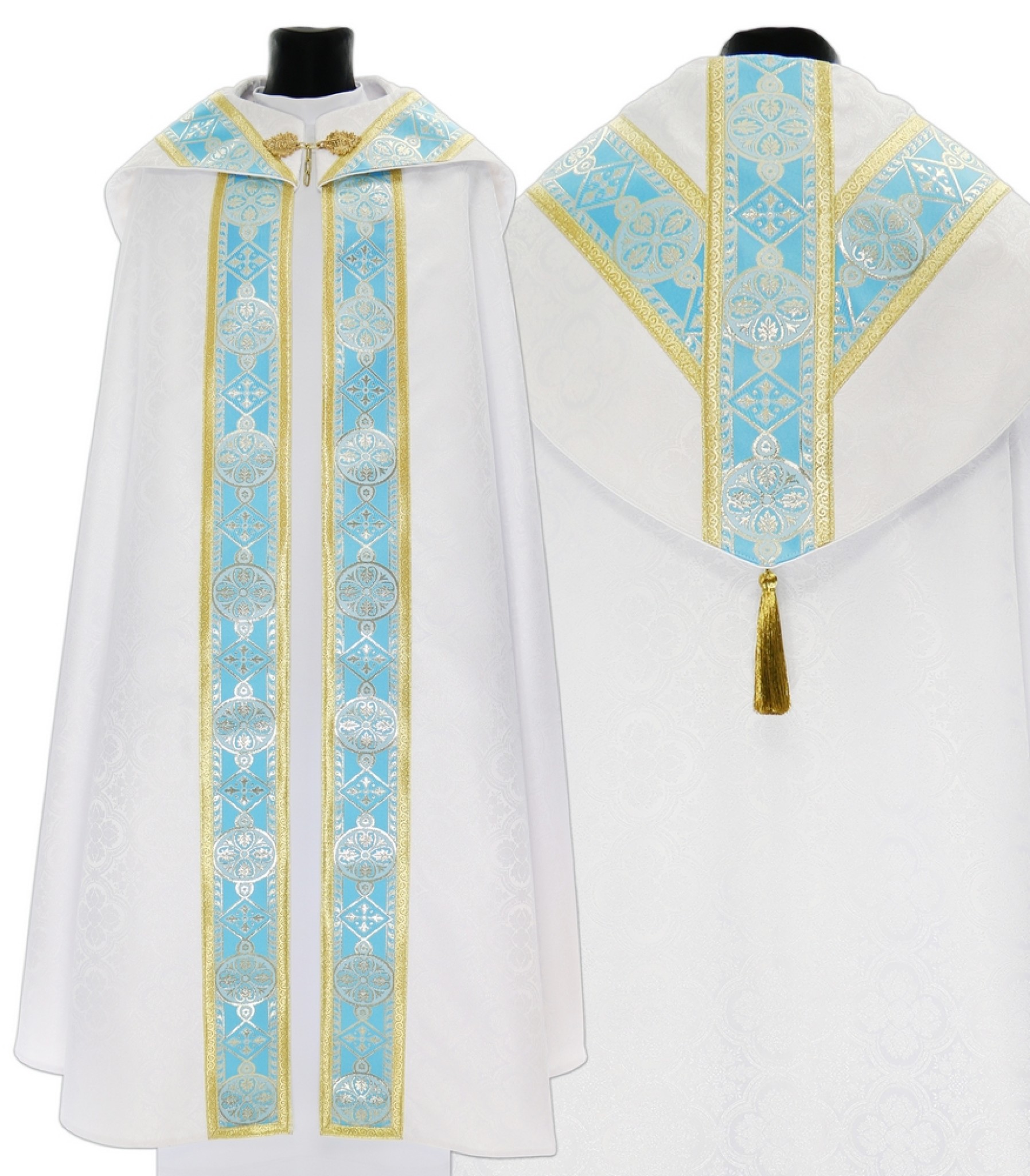 Une chape liturgique mariale  en tissu damassé non doublé. Chape ornée d'un galon bleu et d'un gland à l'extrémité du capuchon.