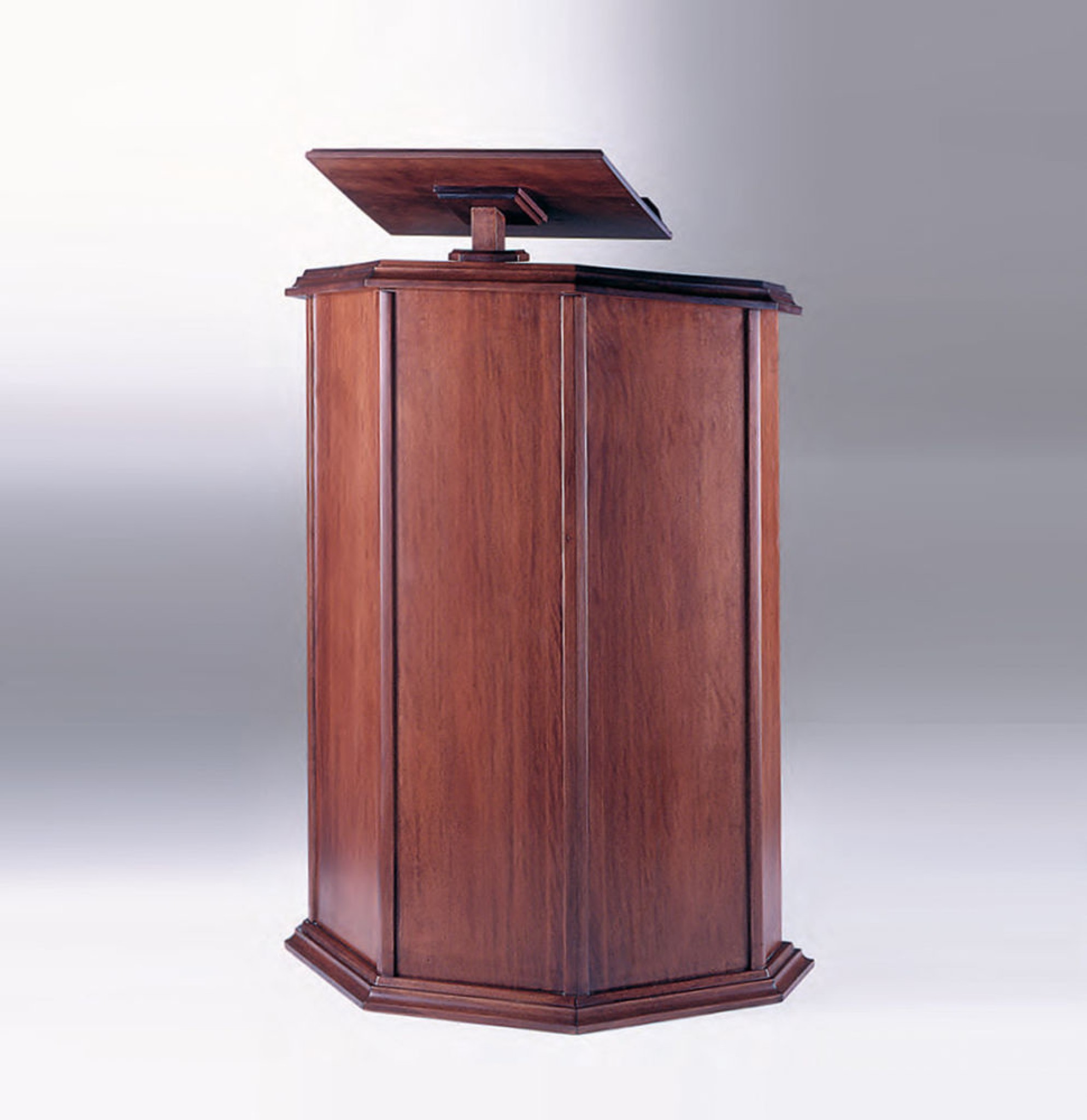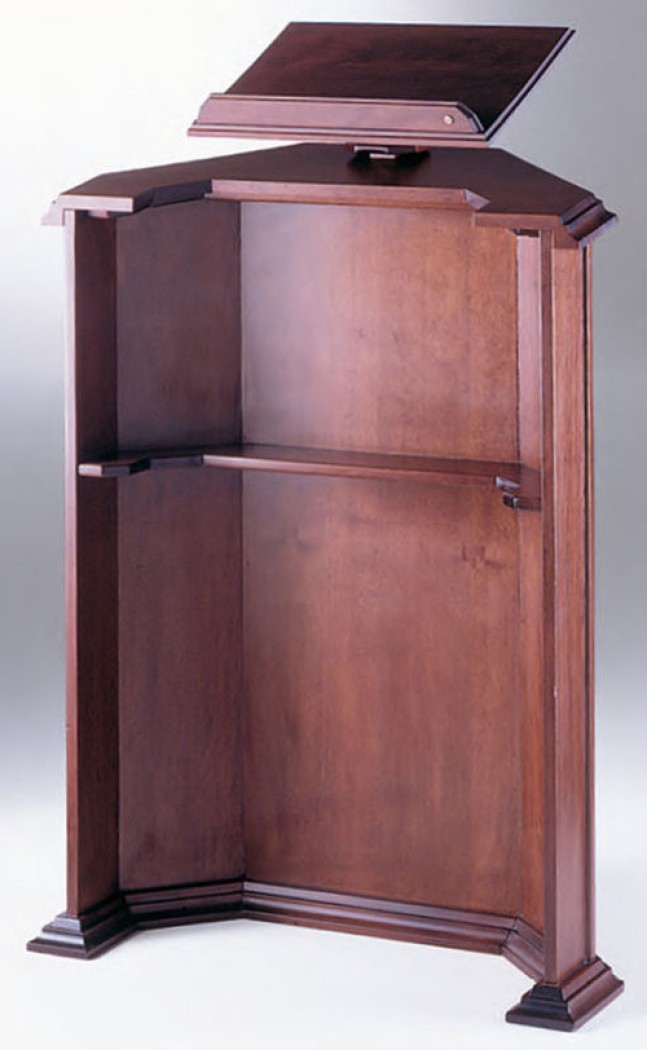 Ambon en hêtre teinte foncé avec pupitre réglable en hauteur. Hauteur de l'ambon : 110 cm, largeur : 80 cm, profondeur : 41 cm.