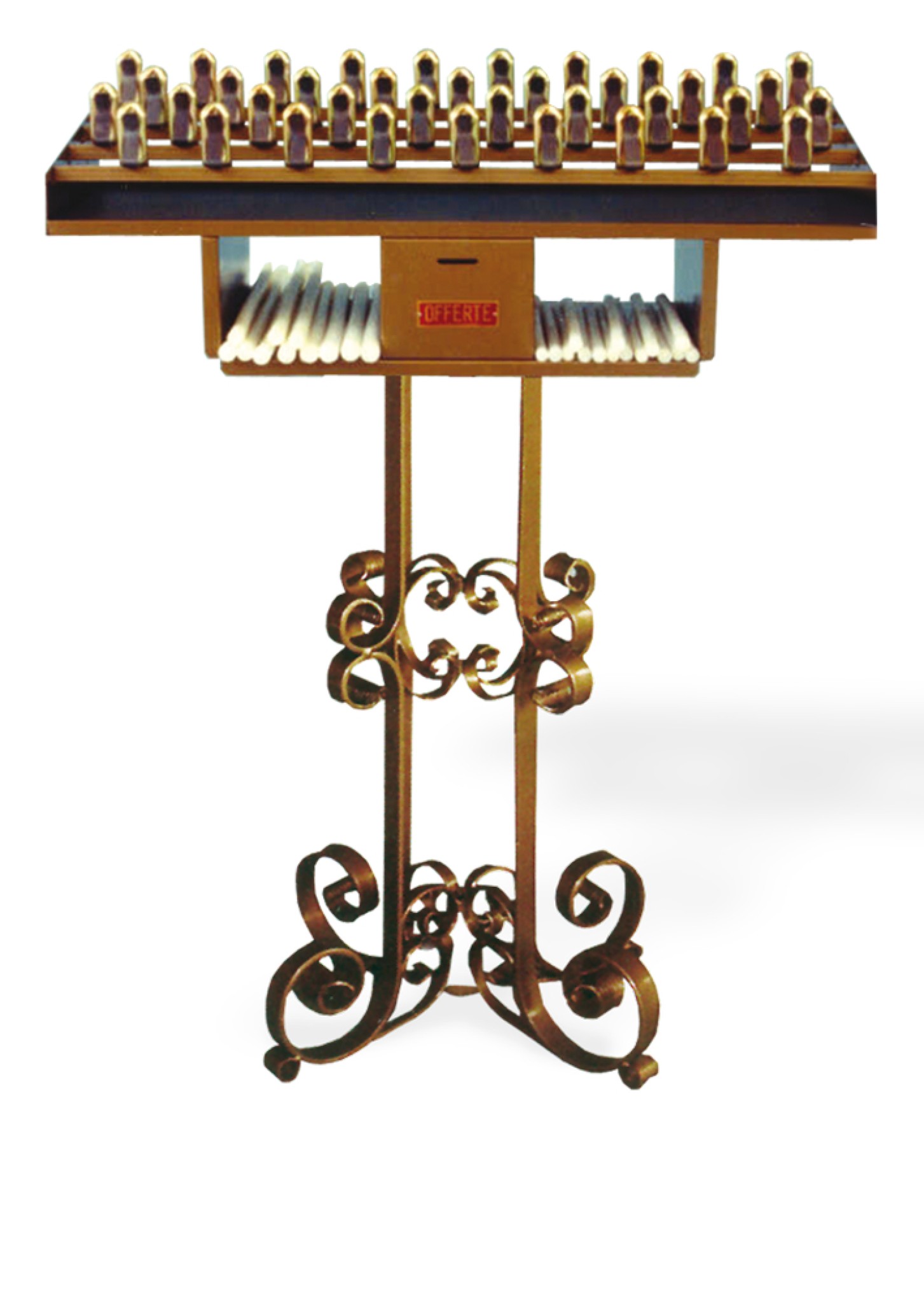 Brûloir en fer forgé pour 26 cierges de dévotion à pinces avec un emplacement réservé à l'offrande (sécurisé) et un emplacement pour présenter les cierges. couleur doré martelé. Autre couleur sur demande. Dimensions : 72 cm de large, 26 cm de profondeur et 93 cm de hauteur. Visuel non contractuel