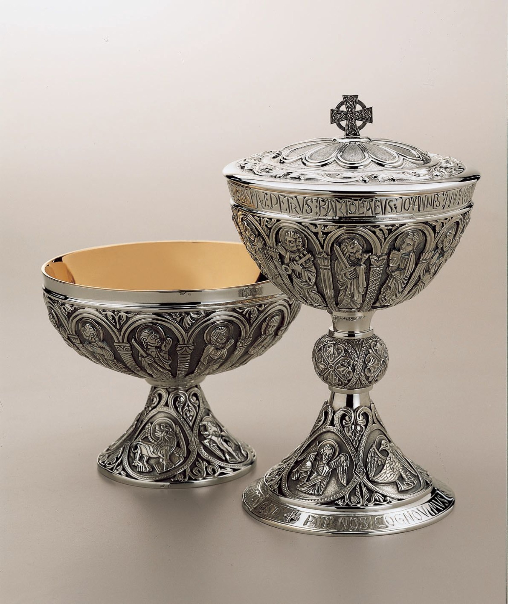 En laiton argenté. Possibilité d'avoir une coupe de communion avec la coupe intérieure en argent massif, ou une coupe de communion entièrement en argent. Pour cela nous contacter. Photo non contractuelle, uniquement la coupe de communion est comprise dans le prix.