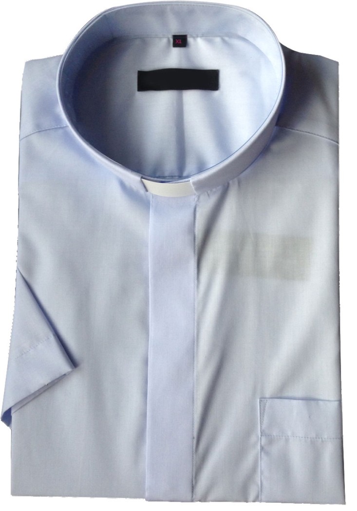 Chemise clergyman mixte polyester (45%) coton (55%) de couleur bleue ciel. Taille de la chemise clergyman: XXL (équivalent 45 & 46 en tour de cou) Tour de poitrine 135 cm longueur de chemise 82 cm. Col plastique clergyman fourni et inséré dans le col. Lavable en machine à 40°, repassage facile au fer sur faible température.