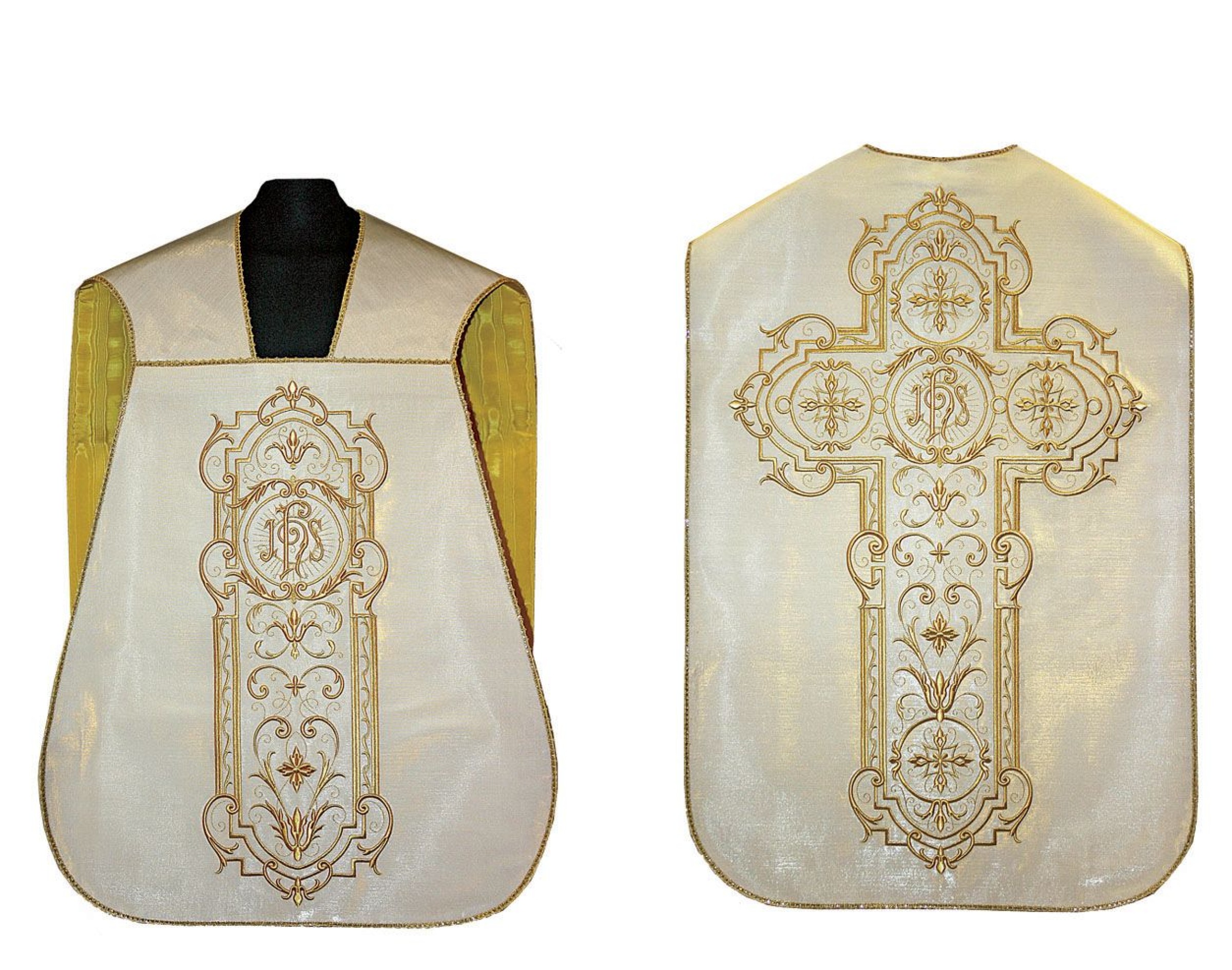 Magnifique chasuble romaine en tissu lamiglia blanc avec des reflets dorés. Brodée machine avec voile de calice, bourse, manipule et étole. Chasuble romaine ornée d'une croix au dos.