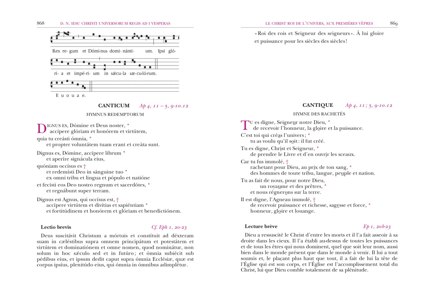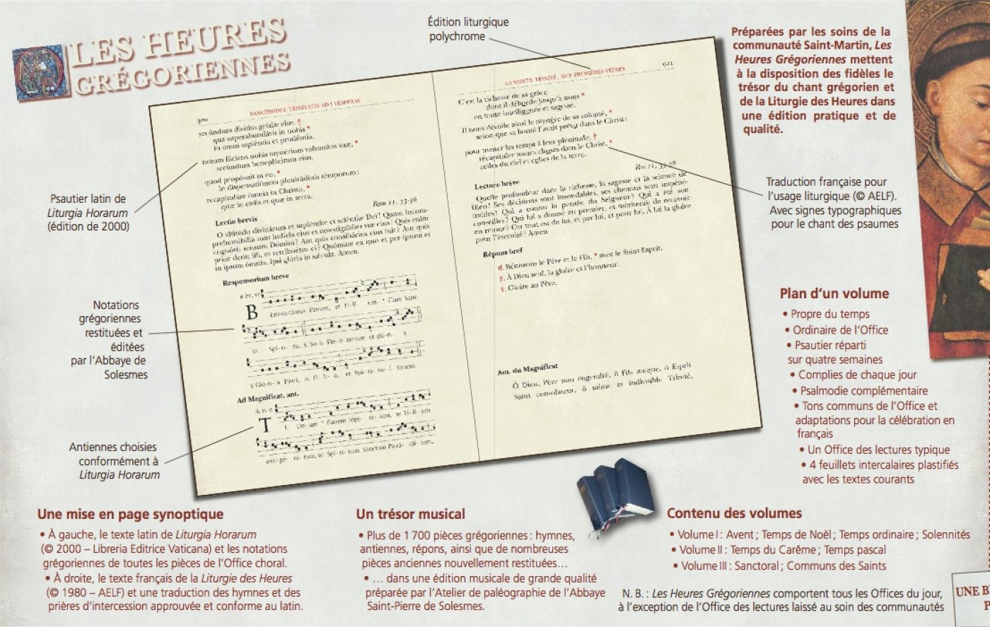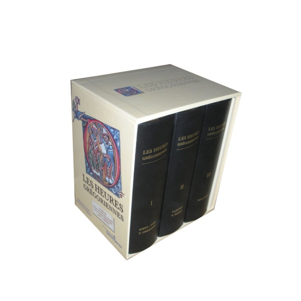 Les Heures grégoriennes mettent à la disposition des fidèles le trésor du chant grégorien et les textes français officiels de la Liturgie des Heures dans une édition pratique et de qualité, approuvée à plusieurs reprises, notamment par S. E. le Cardinal Arinze, préfet de la Congrégation pour le Culte divin le 9 juillet 2004, et par S. E. le Cardinal Cañizares, préfet de la même Congrégation le 13 avril 2011, ainsi que par différentes autres personnalités ecclésiales. Édition polychrome sur papier bible. Sur la page de gauche : l'office en latin et grégorien. Sur la page de droite : traduction officielle de la Liturgie des Heures en français. Volume I (2146 p.) : Temporal sauf Carême et Temps pascal Volume II (2058 p.) : Carême et Temps pascal Volume III (2192 p.) : Sanctoral et commun des Saints Remarque importante : Les Heures Grégoriennes comportent tous les Offices du jour, à l'exception de l'Office des lectures laissé au soin des communautés.