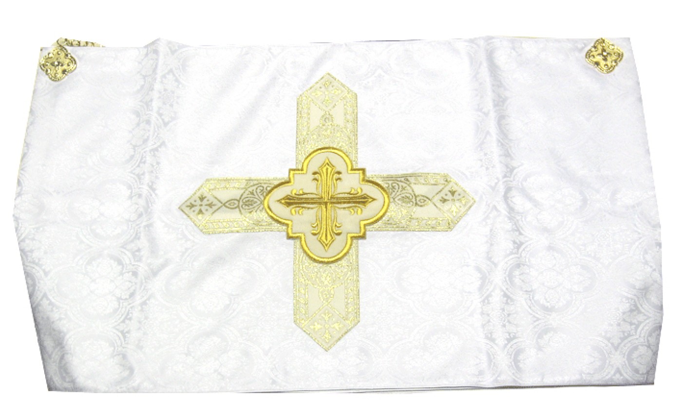 Voile huméral en polyester damassé. Voile huméral orné de galon tissé en forme de croix et d'un emblème croix brodé machine. Dimensions du voile huméral : 300 cm de long par 50 cm de large.