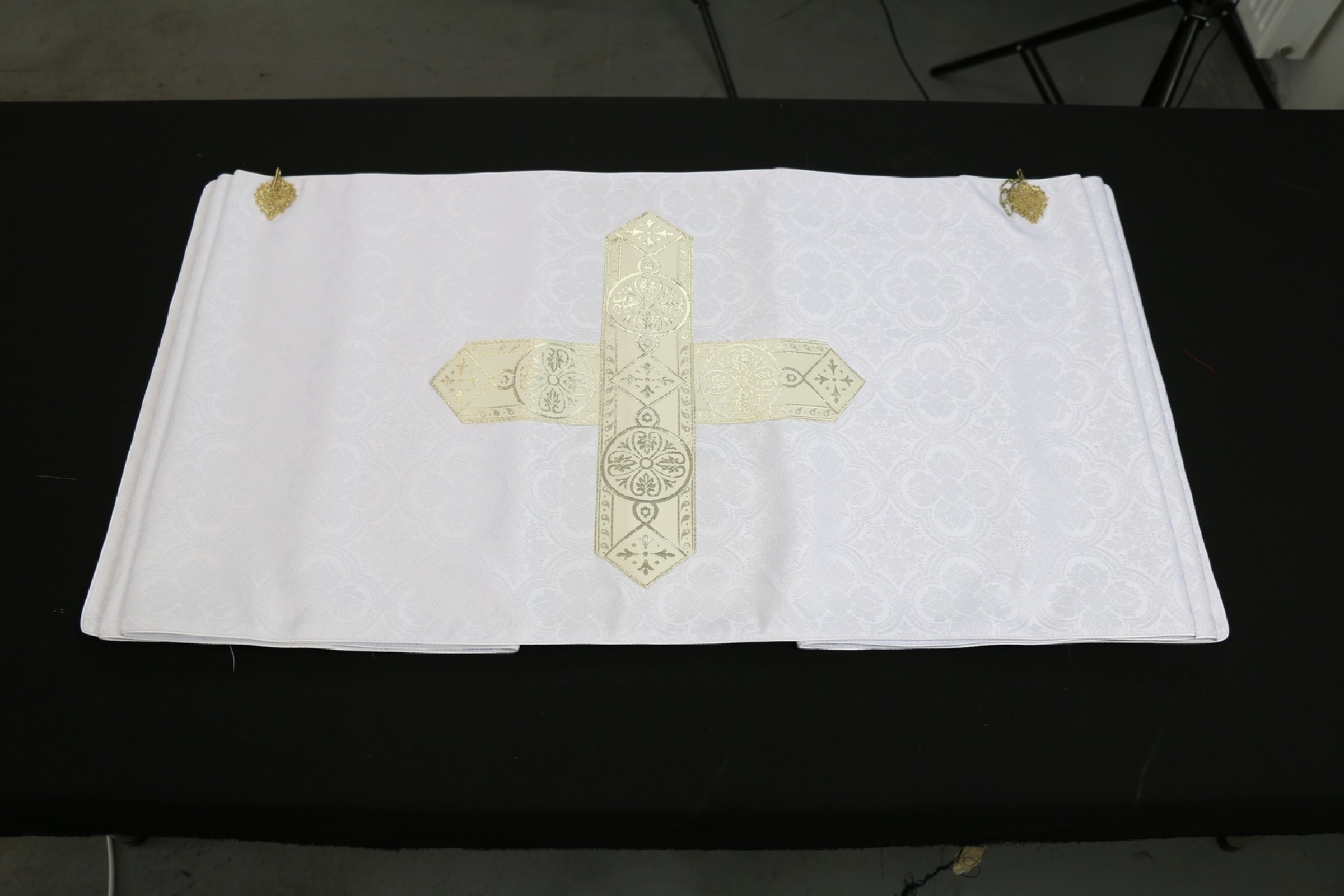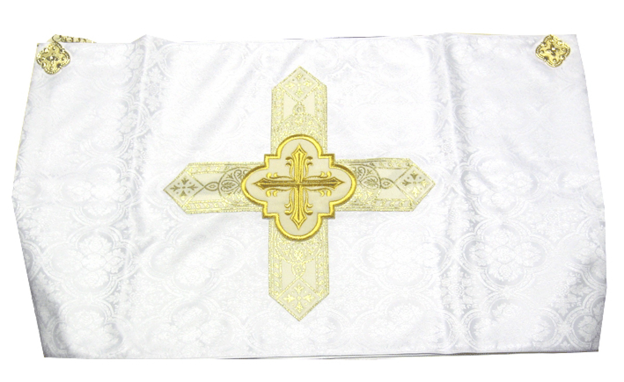 Voile huméral blanc emblème croix dorée sur fond blanc damassé