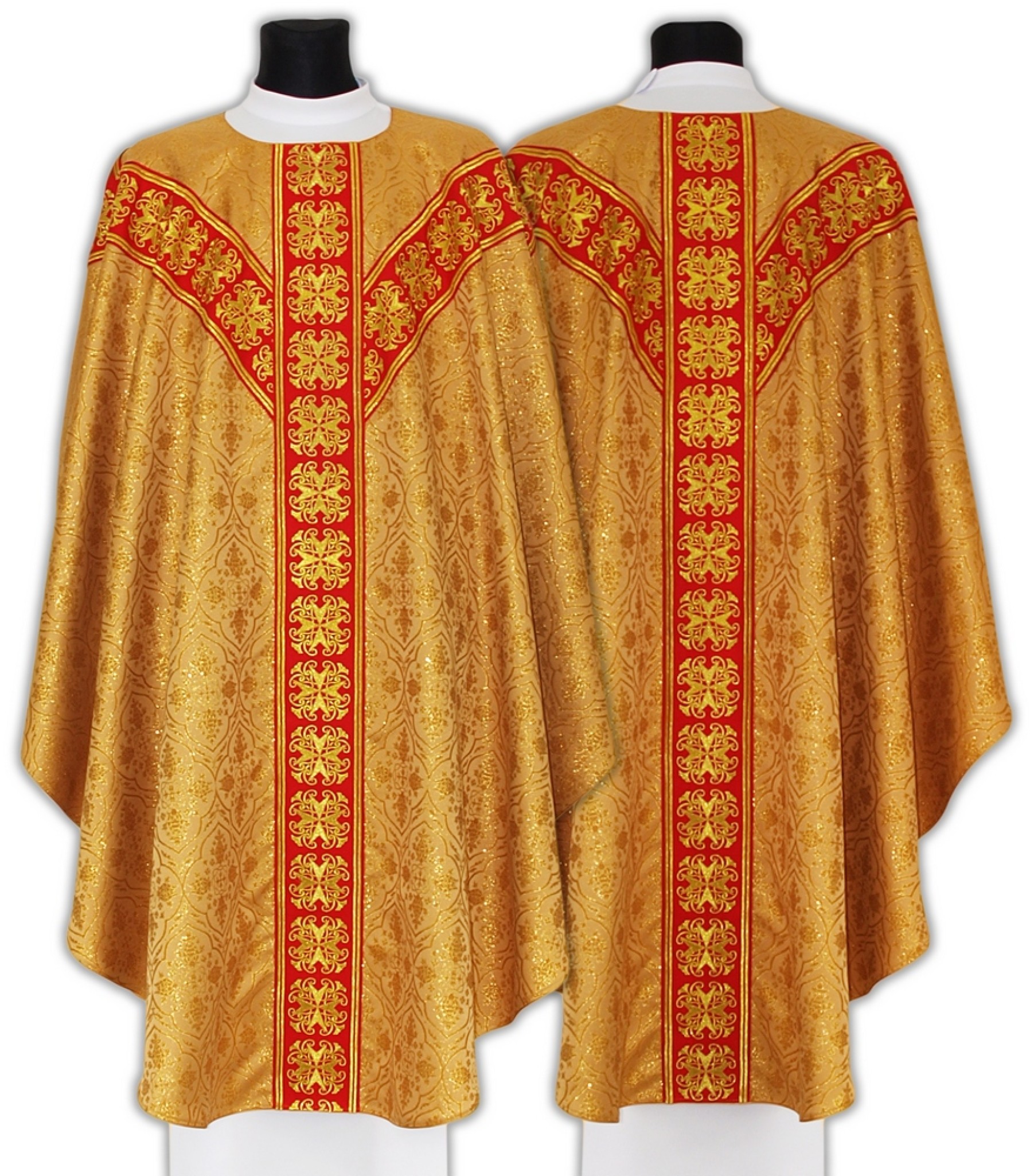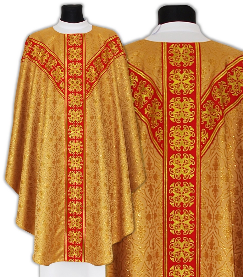 Chasuble dorée croix de saint André. En polyester damassé non doublé, ornée d'un galon de velours brodé posé en forme de croix de Saint-André. Chasuble dorée livrée avec son étole liturgique.