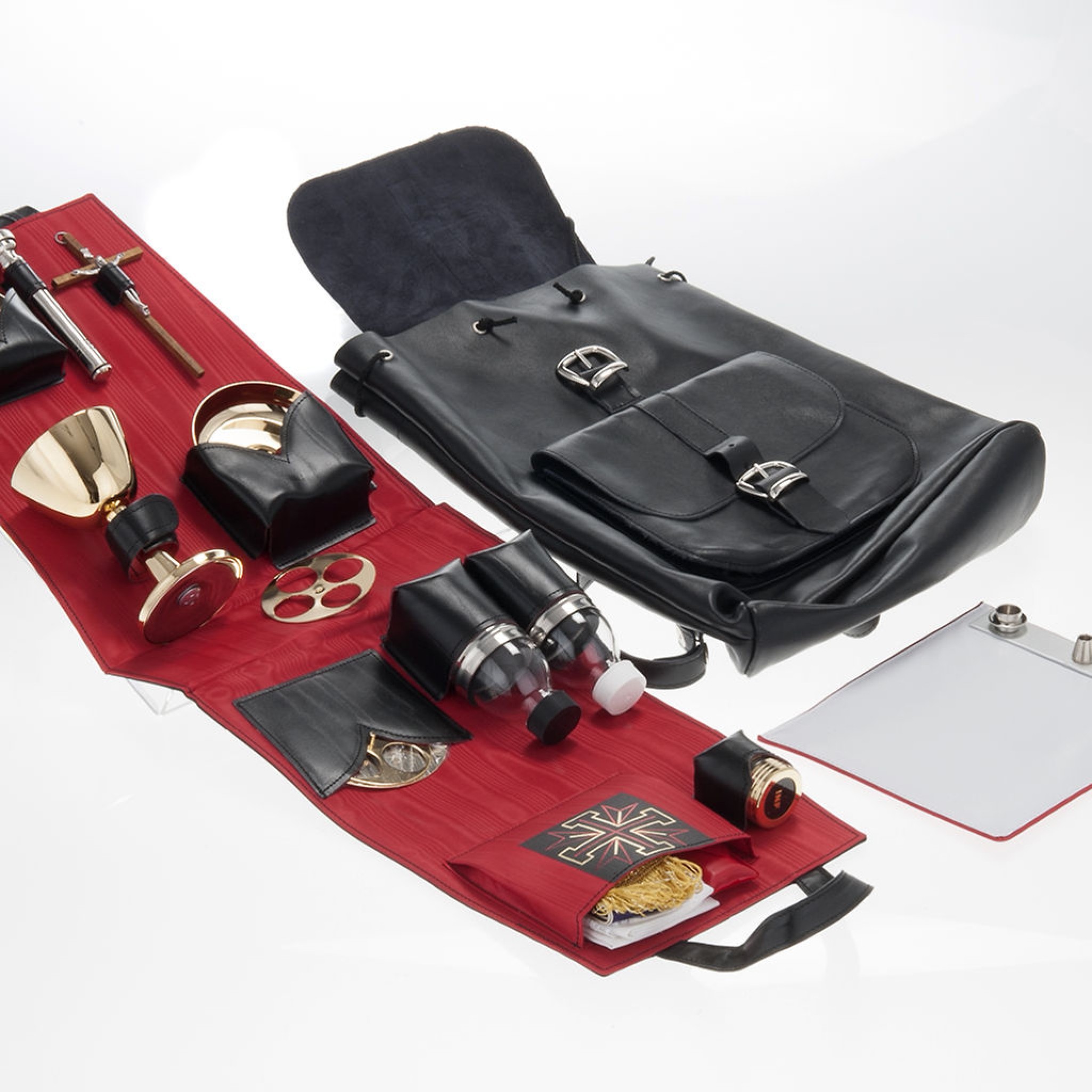 Une valise chapelle qui comprend tout le nécessaire pour célébrer la messe dans un sac à dos en cuir.