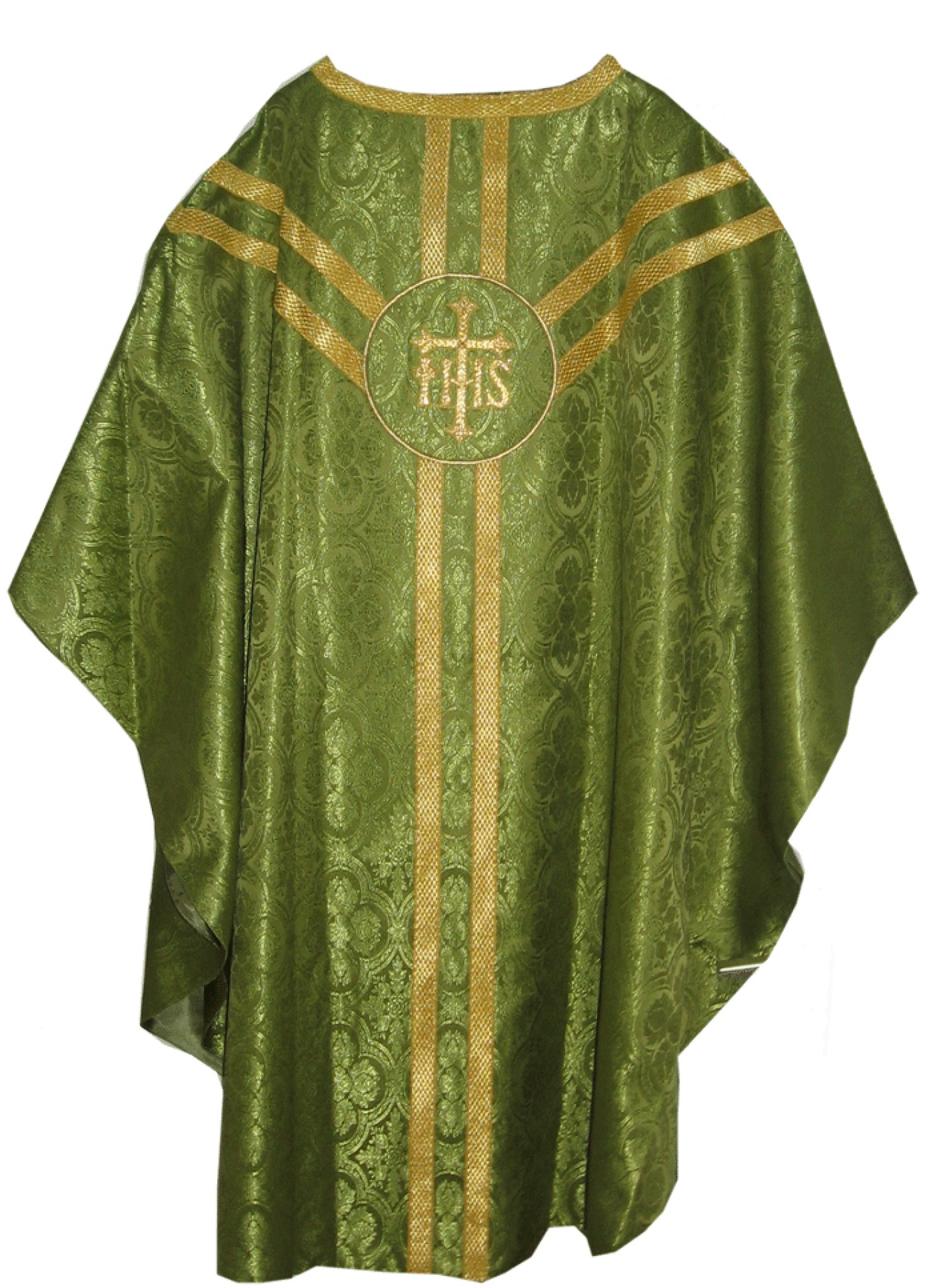 Chasuble liturgique en polyester damassé doublé. Orné de bande de galon doré formant une croix de st André, orfroi brodé main devant et dos. Finition soignée de l'étole orné de franges métalliques. Chasuble fournie avec son voile de calice, sa bourse et son voile de calice.