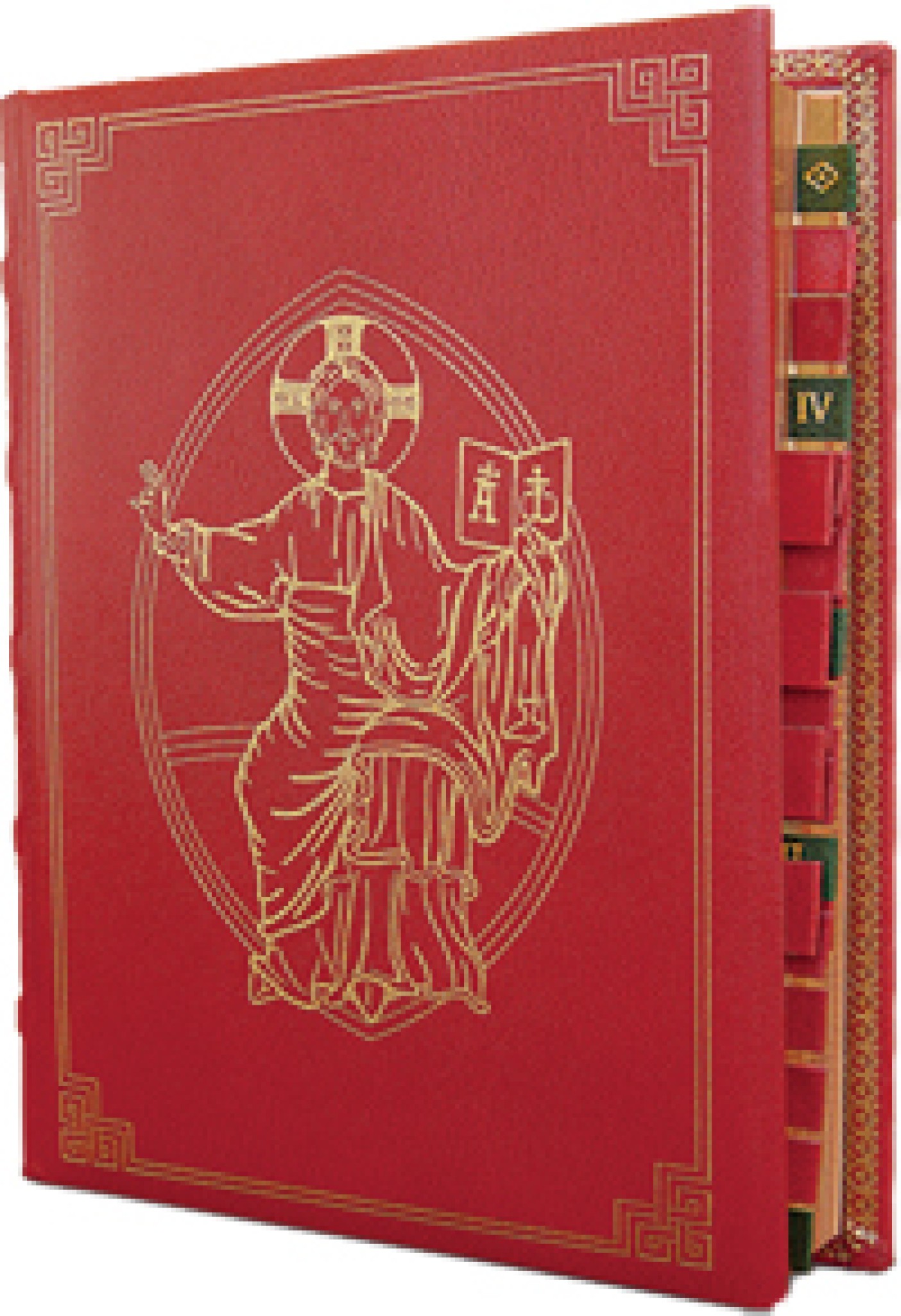 Edition richement ornée avec une couverture en cuir véritable portant un Christ Pantocrator doré à chaud au recto et d'un Chrisme au verso. Contenant des pages avec des reproductions de l'art liturgique.