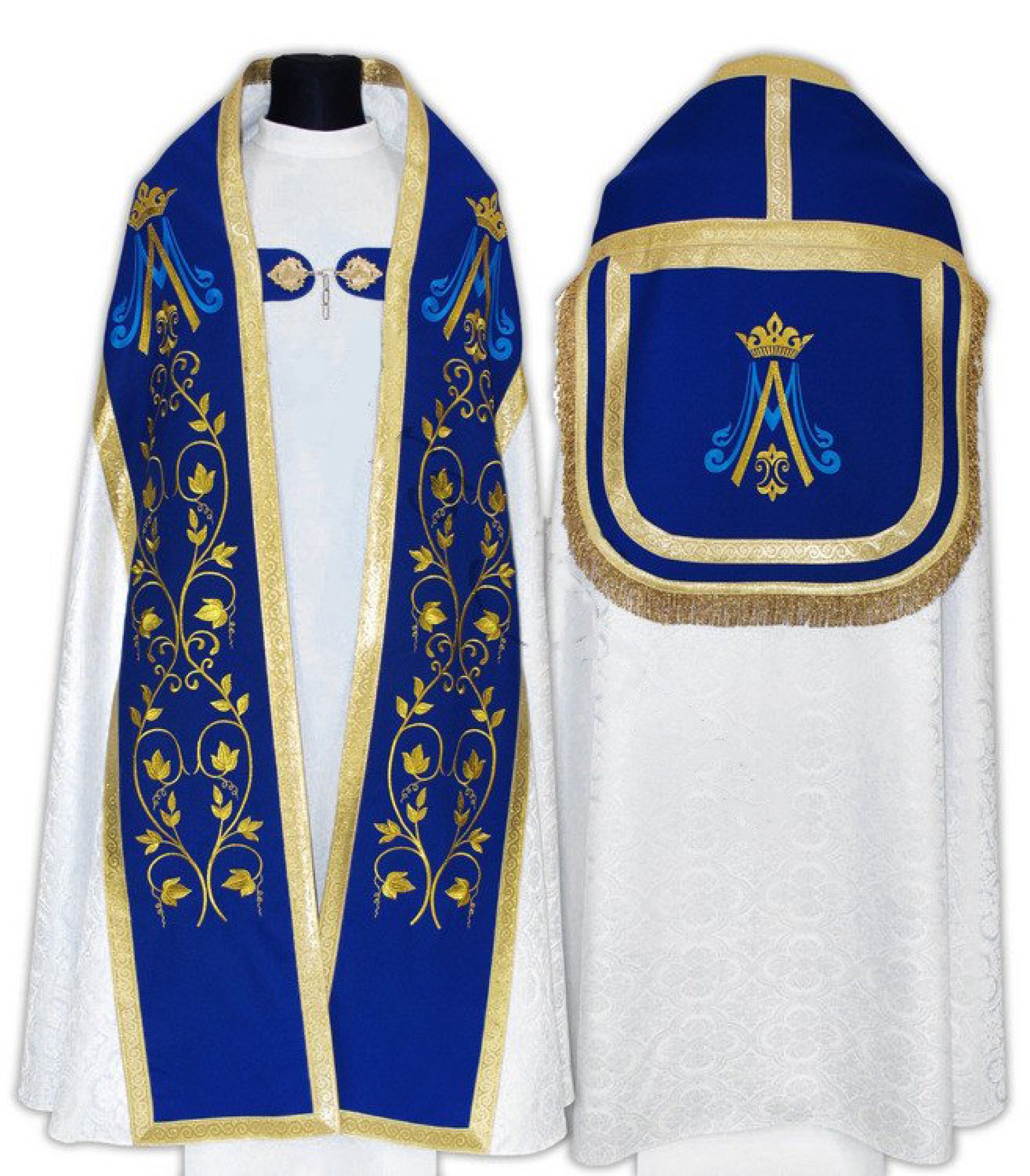 Chape mariale, coupe traditionnelle en polyester damassé doublée. Ornée de galon de velours avec des croix brodées. Chape mariale fournie avec son étole liturgique. Ornement pour les fêtes mariales : assomption, annonciation, etc… Longueur de l'ornement marial : 145 cm