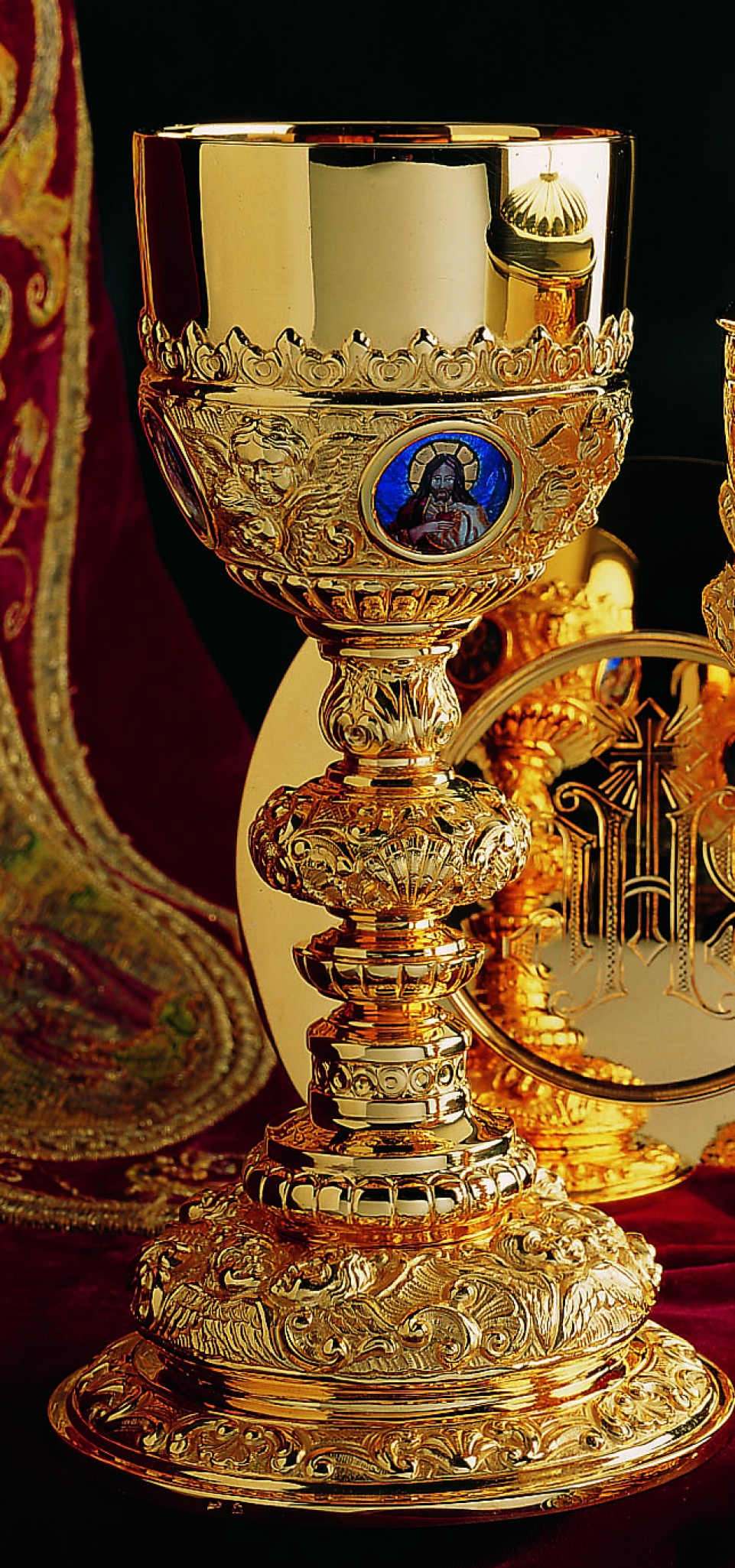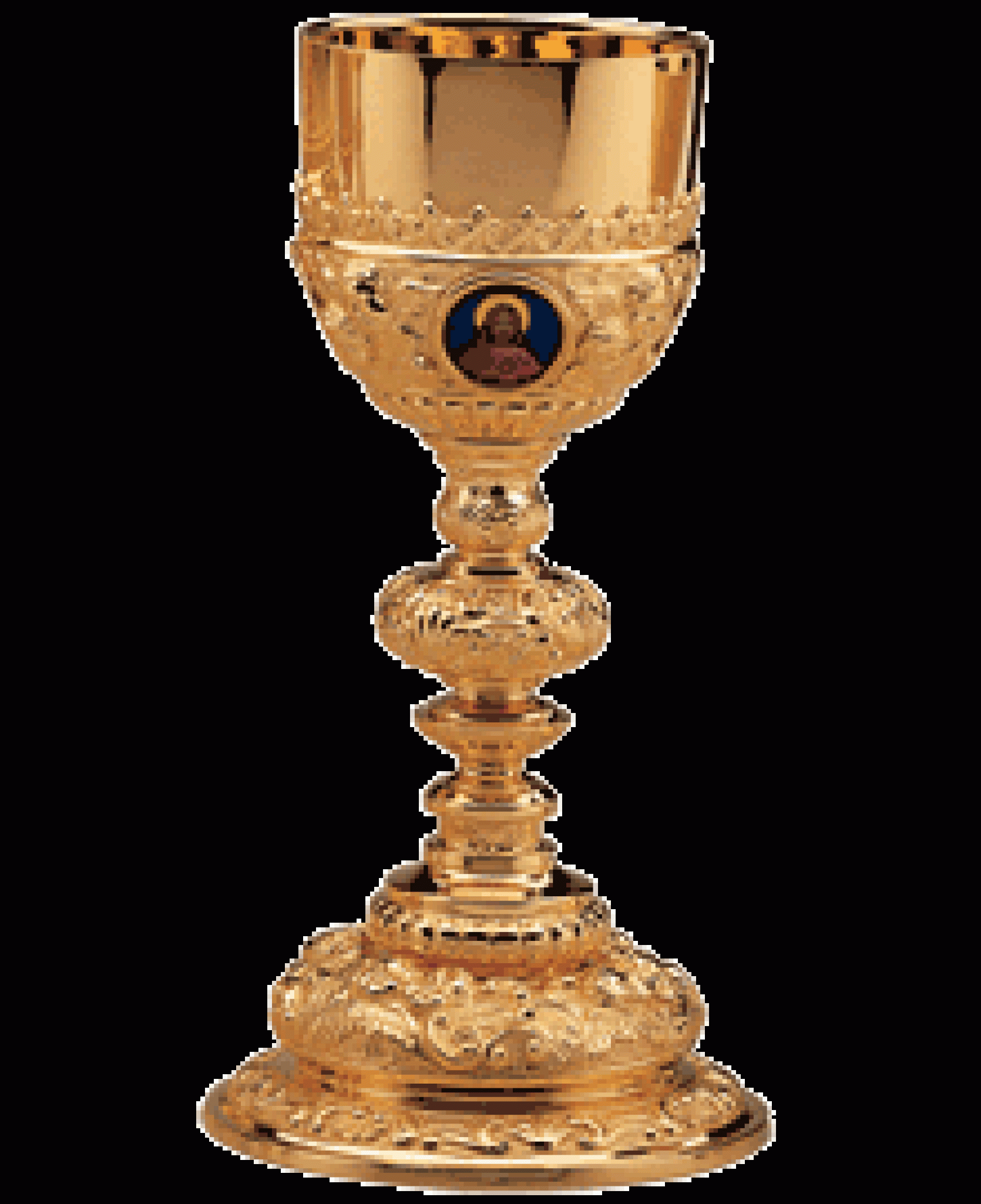 Calice de style baroque en argent massif. Vase sacré magnifiquement orné avec ciselure en bas-relief, travail avec des médaillons au feu qui représente tous les personnages de la sainte famille. Dimensions du calice : 23,5 cm hauteur, Ø la coupe 9,5 cm. Magnifique pièce d'orfèvrerie liturgique qui embellira la célébration de vos messes.