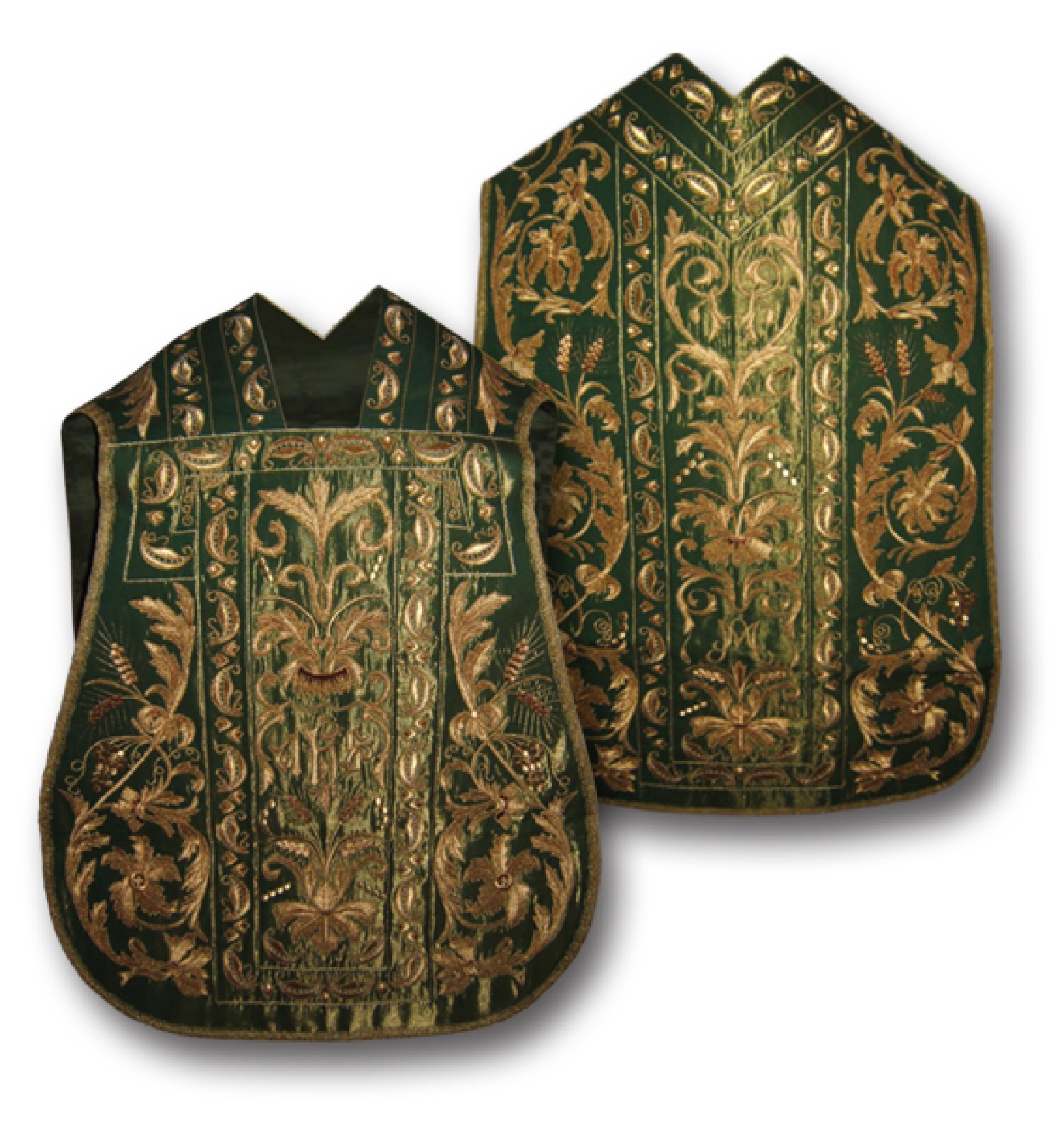 Chasuble romaine verte doublée et richement brodée machine au fil doré sur un tissu polyester à reflets dorés. Les broderies représentent des motif de vigne et de blé, le tout donnant un style baroque à la chasuble. Chasuble dite "boite à violon" livrée avec son étole, son manipule, son voile de calice et sa bourse. Chasuble romaine pour la liturgie du temps ordinaire.