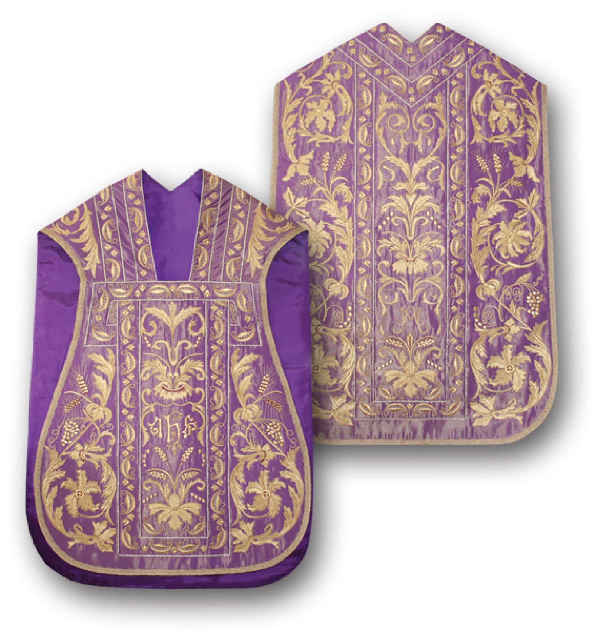 Chasuble romaine violette doublée et richement brodée machine au fil doré sur un tissu polyester à reflets dorés. Les broderies représentent des motif de vigne et de blé, le tout donnant un style baroque à la chasuble. Chasuble dite "boite à violon" livrée avec son étole, son manipule, son voile de calice et sa bourse. Chasuble romaine pour la liturgie du temps de l'avent ou du carême.