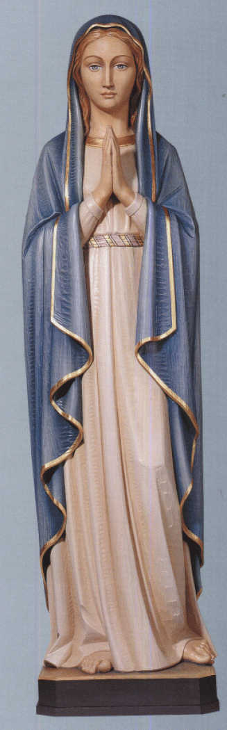 Statue de Notre-Dame-Immaculée-Conception sculptée en bois et peinte à la main. Hauteur de la statue de Notre-Dame-Immaculée-Conception 75 cm. Notre-Dame y est représentée en blanche et bleue les mains jointes. Statue magnifiquement réalisée par les ateliers d'art Demetz.