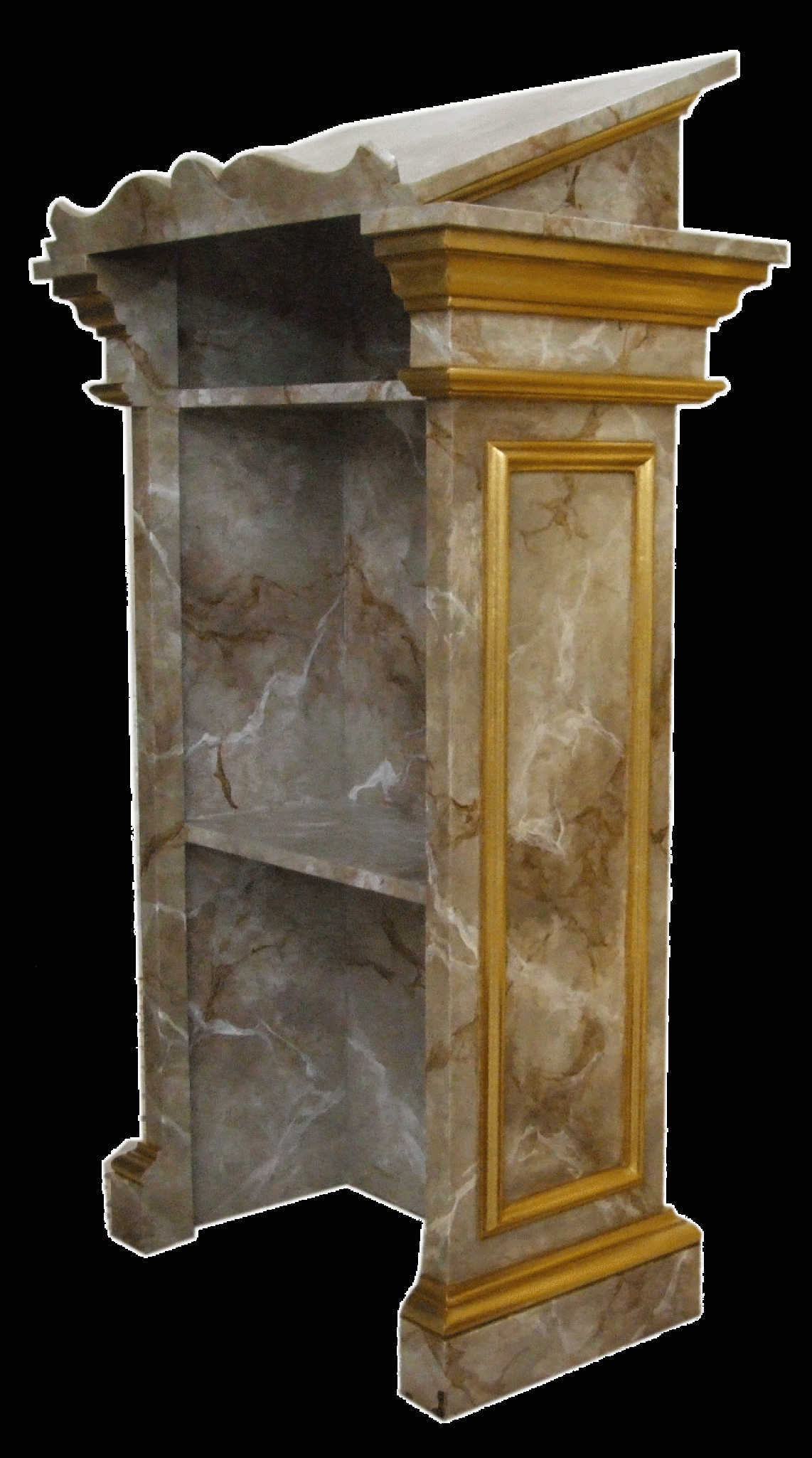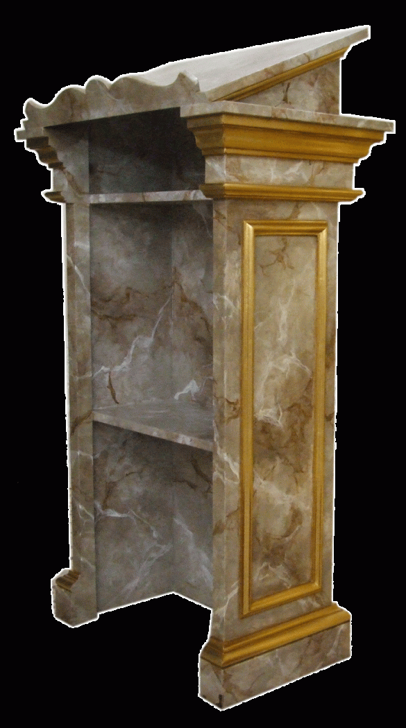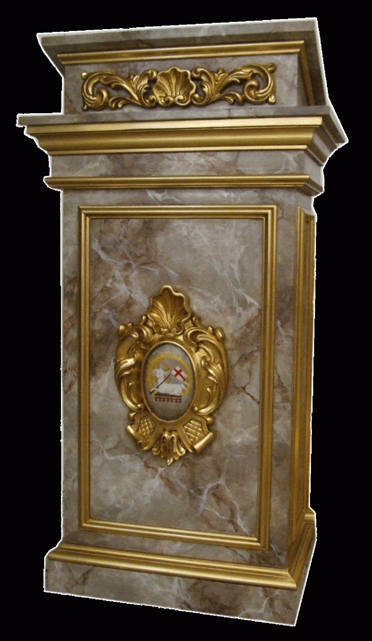 Magnifique ambon en bois peint et orné de baguette dorée et d'un agneau au centre. L'ambon comprend une étagère à l'intérieur et un pupitre ouvragé. Possibilité de prendre en compte la couleur marbré de votre mobilier existant pour réaliser un ambon assorti et créer une unité dans votre choeur.