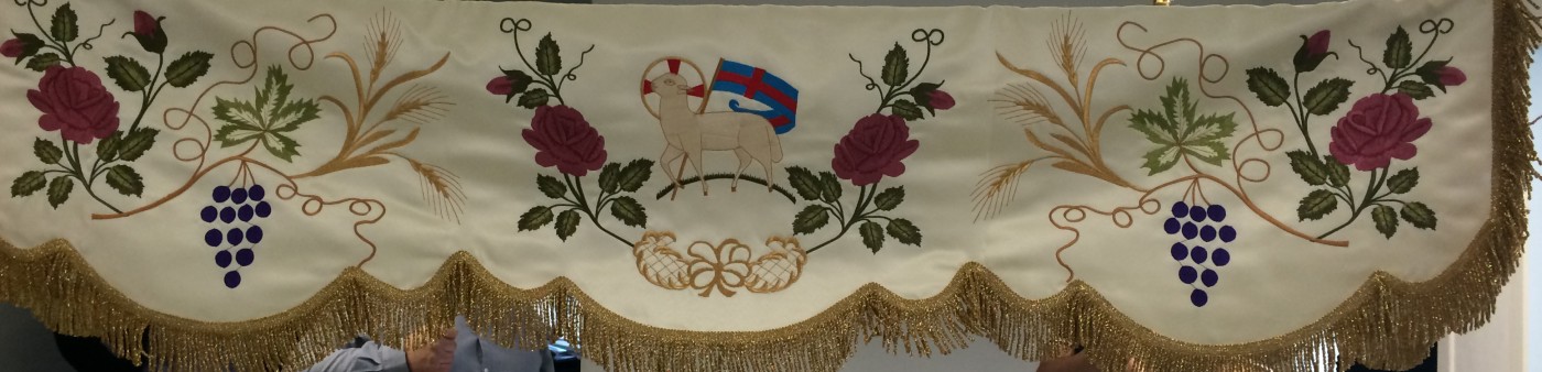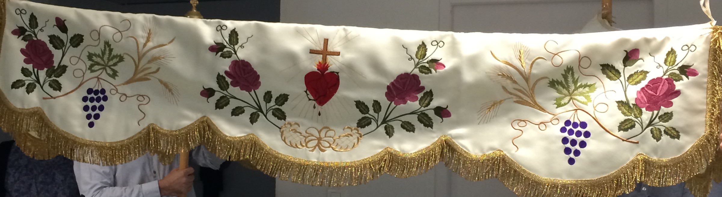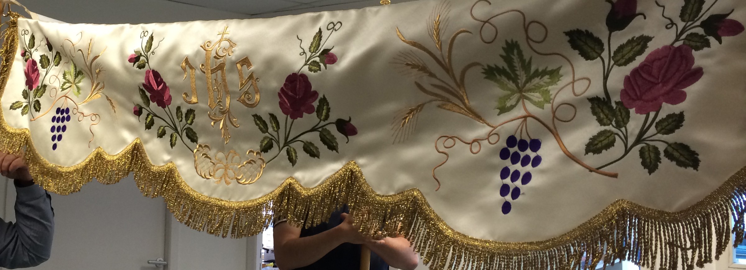 Dais de procession (sans hampe), d'une dimensions : 160 cm de long par 120 cm de large en polyester. Le dais est brodé sur les quatre faces avec un motif IHS, un agneau pascal, un sacré-coeur et un calice. Le dessus du dais est orné d'une colombe. Le dessus est protégé par un plastique en cas d'intempérie. Ce dais peut s'utiliser avec seulement quatre hampes (de manière souple) ou en incorporant une structure (de manière rigide). Des franges souples (non métallique) ornent le dais. Structure à prévoir.