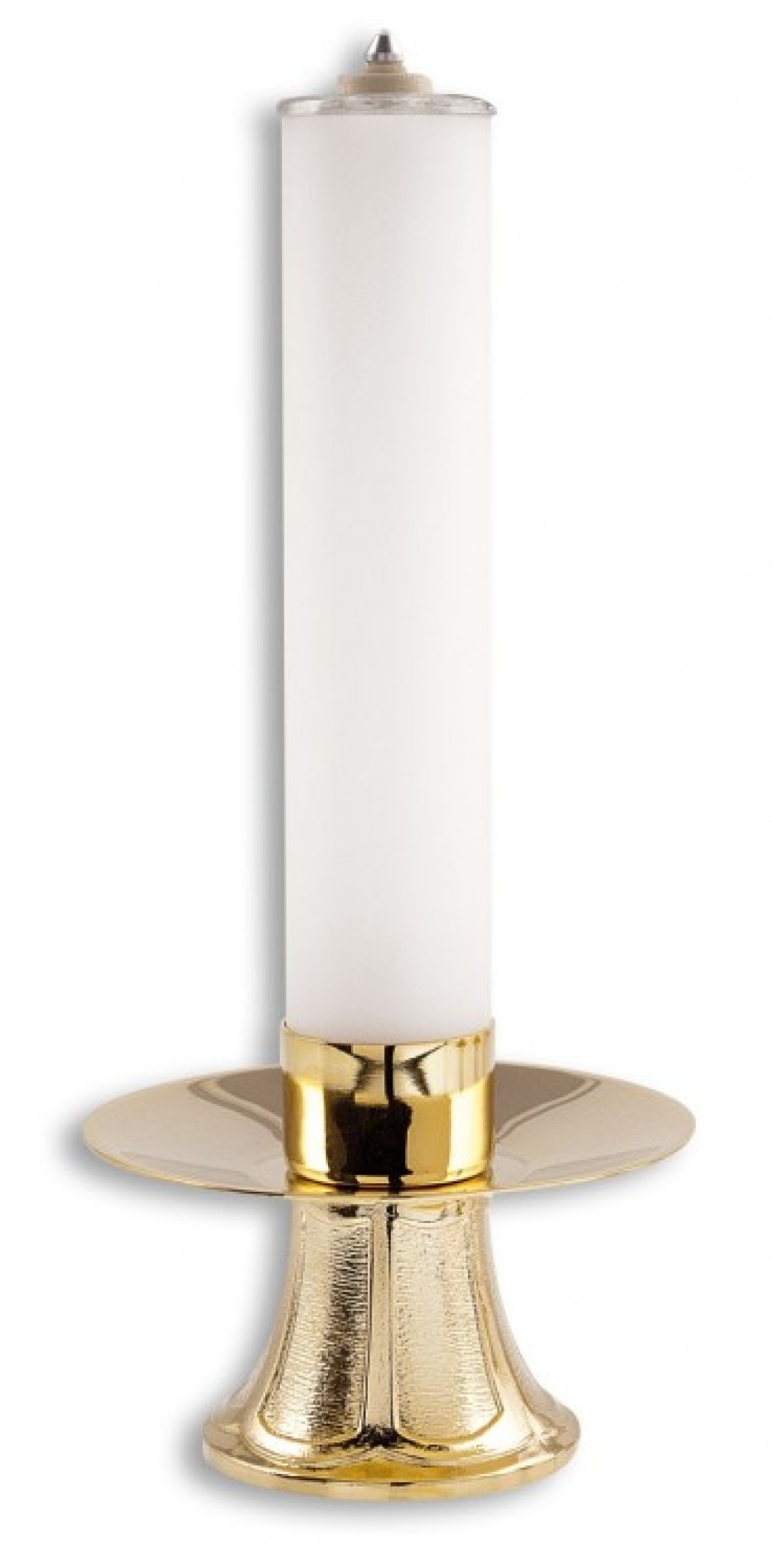 Une paire de chandeliers d'autel avec une base de 7,5 cm, le diamètre de la coupe est de 15 cm. La hauteur du chandelier est de 6,3 cm Le Ø intérieur pour le cierge est de 4 cm. Le cierge avec sa recharge rechargeable mesure 25 cm de haut avec un diamètre de 4 cm. Vendue en paire par deux exemplaires.