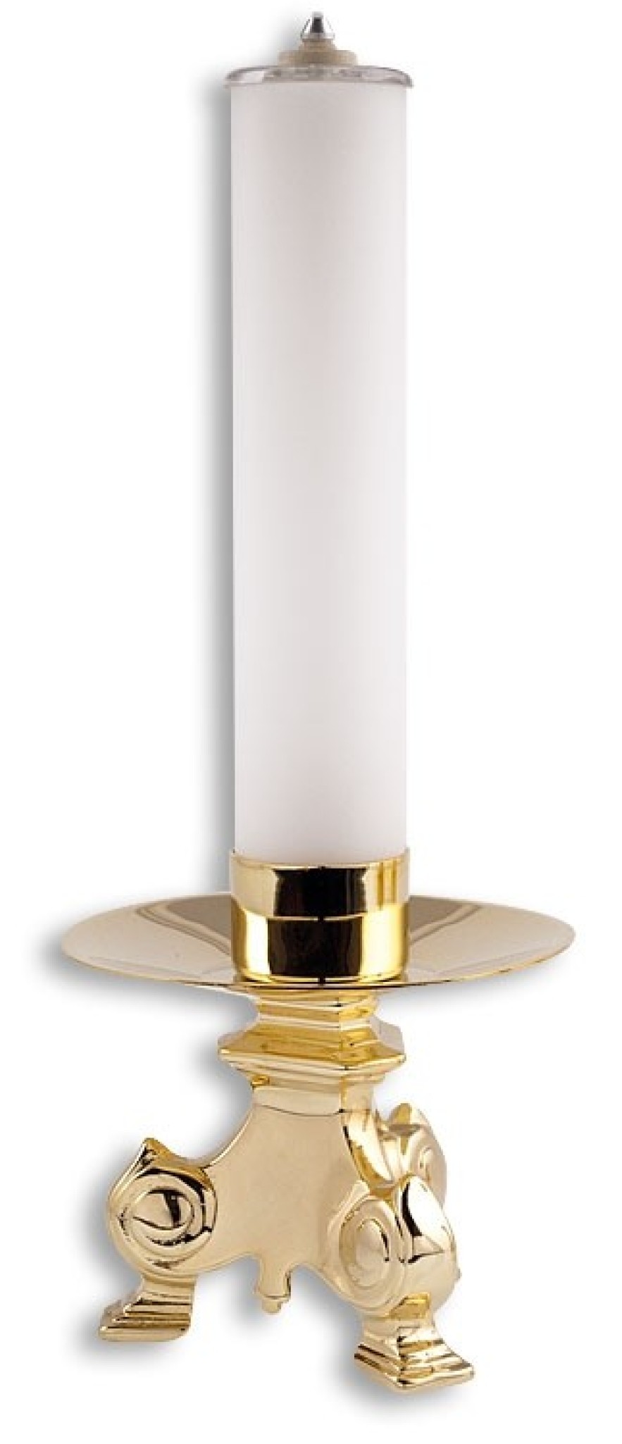 Une paire de chandeliers d'autel avec une coupe de 12 cm environ, la hauteur du chandelier est de 9,5 cm Le cierge avec sa recharge rechargeable mesure 25 cm de haut avec un diamètre de 4 cm. Vendue en paire par deux exemplaires.